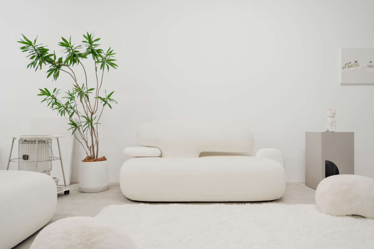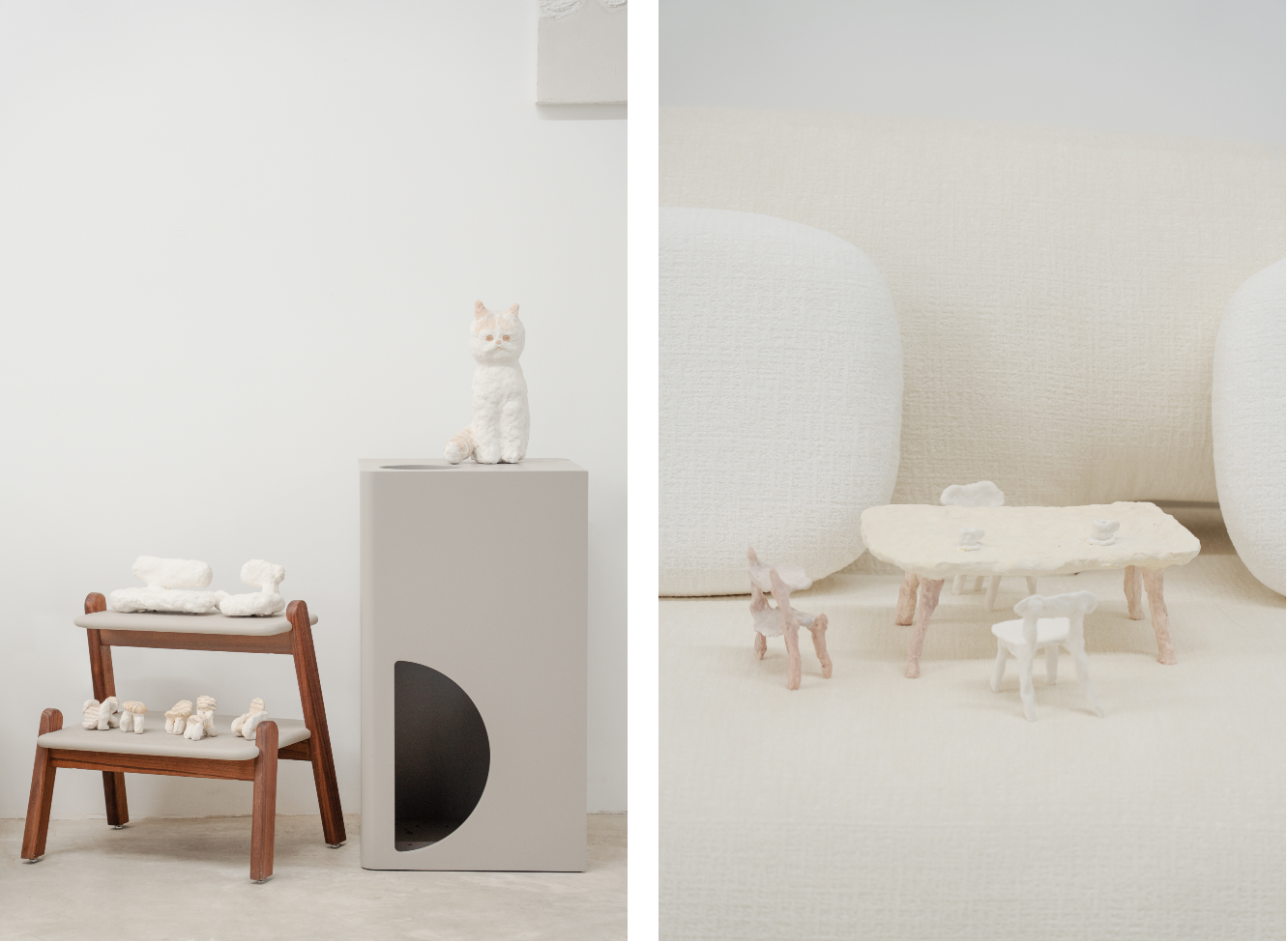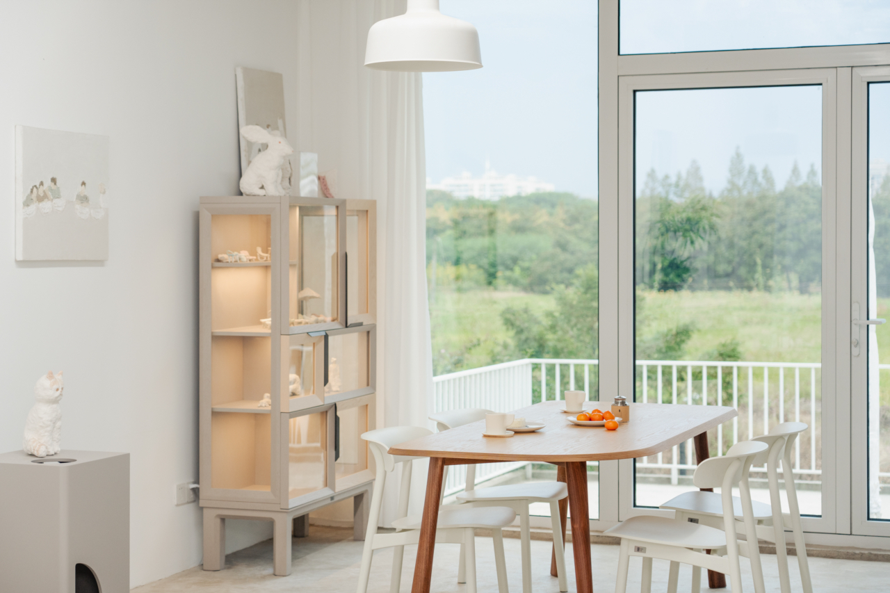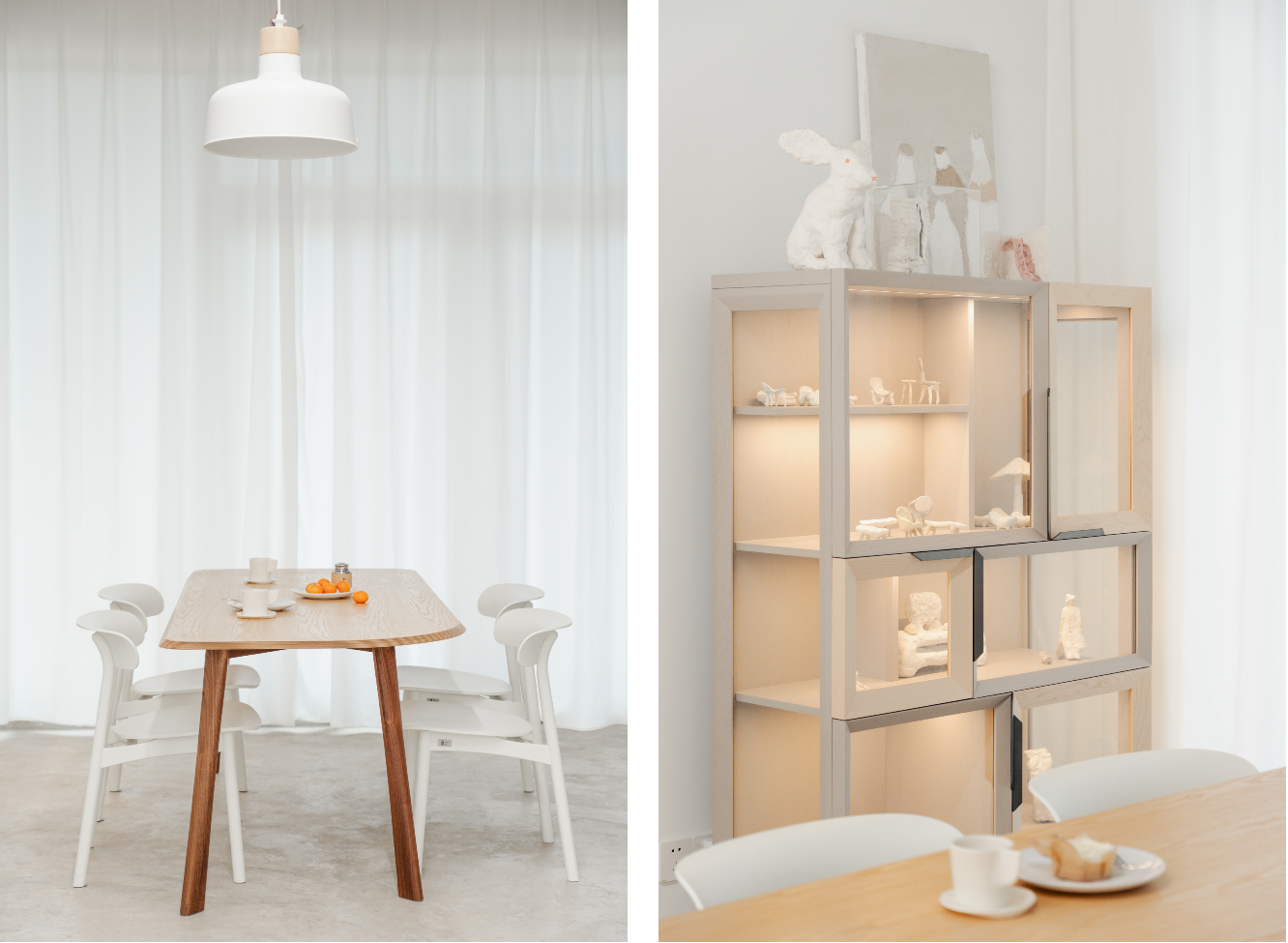 冯玮会选择适合自己的、不啰嗦的设计加入到他的空间。Pine-Pine Sofa雪松版与Pat-Pat Stool、Jenga Cabinet合围出一片安静的会客空间,Loft Square Table与四把留白色Yǎng Chair所在之处成为了靠窗的餐厅,背后的Moments Showcase则展示着他近期的新作。