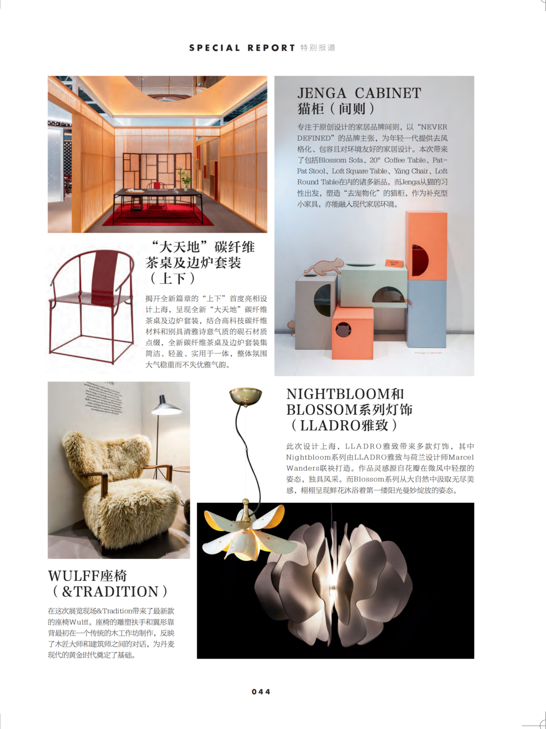 专注于原创设计的家居品牌间则,以“NEVER DEFINED” 的品牌主张,为年轻一代提供去风格化、包容且对环境友好的家居设计。 本次带来了包括Blossom Sofa、20° Coffee Table、Pat-Pat Stool、Loft Square Table,、Yǎng Chair、Loft Round Table在内的诸多新品。 而Jenga从猫的习性出发,塑造“去宠物化”的猫柜,作为补充型小家具,亦能融人现代家居环境。