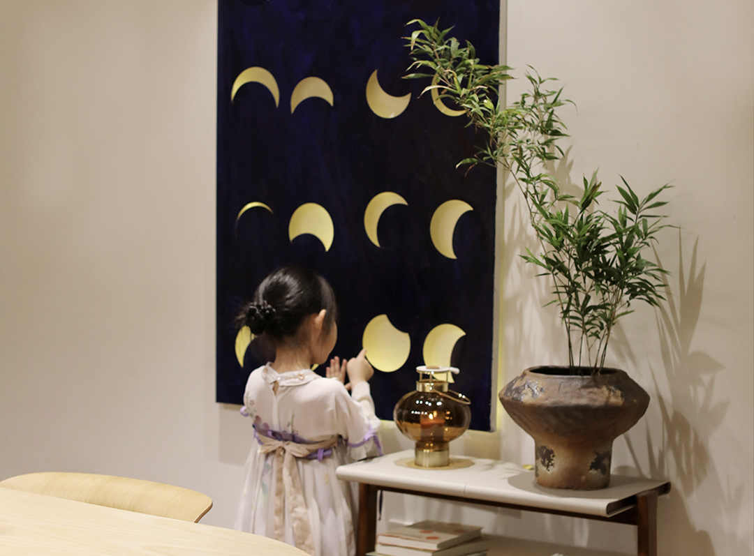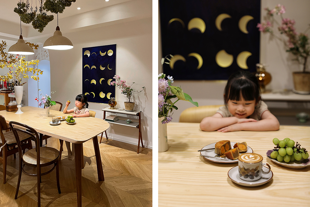小脸家餐厅的大白墙,会随季节变化更替主题:荷叶莲蓬、植物果实、中药标本......都能成为和孩子们一起DIY的挂画现场,为家注入独一无二的生命感与记忆。临近中秋,是时候把月亮挂起来啦。