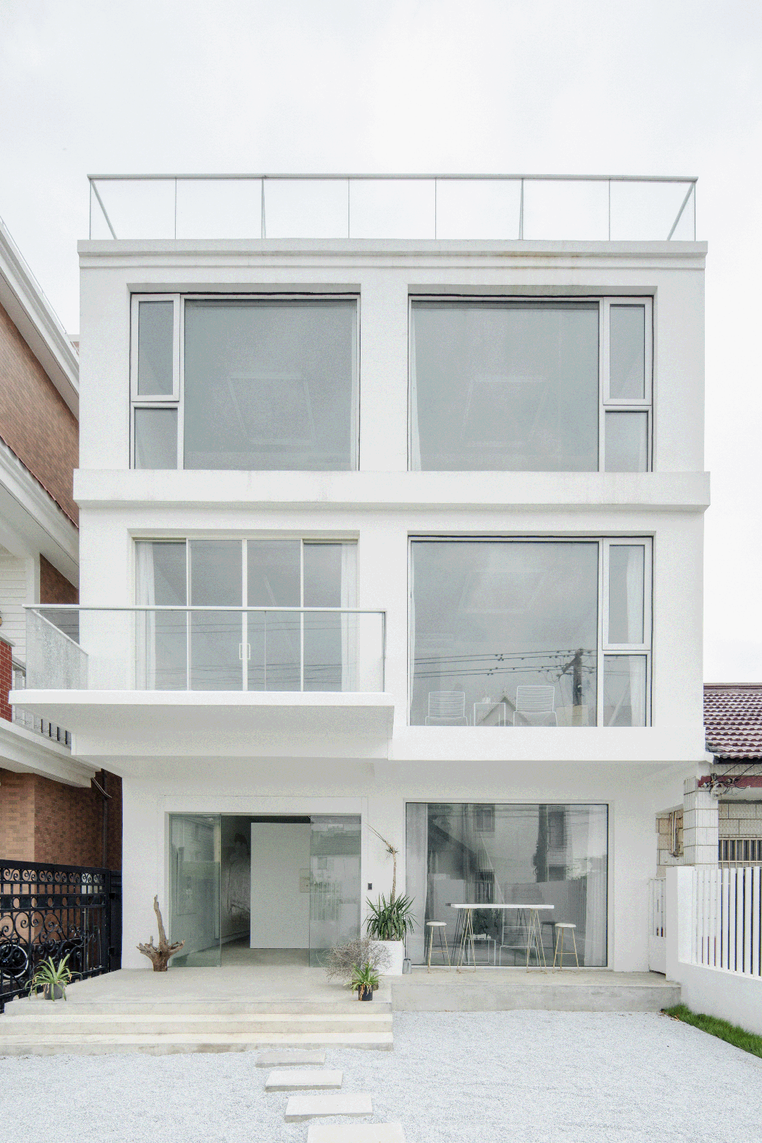 外立面通体全白,没有多余的装饰物。一个个落地窗,自带平面方块的秩序。远看是一个白格子,近看则像是多个白格子的组合。