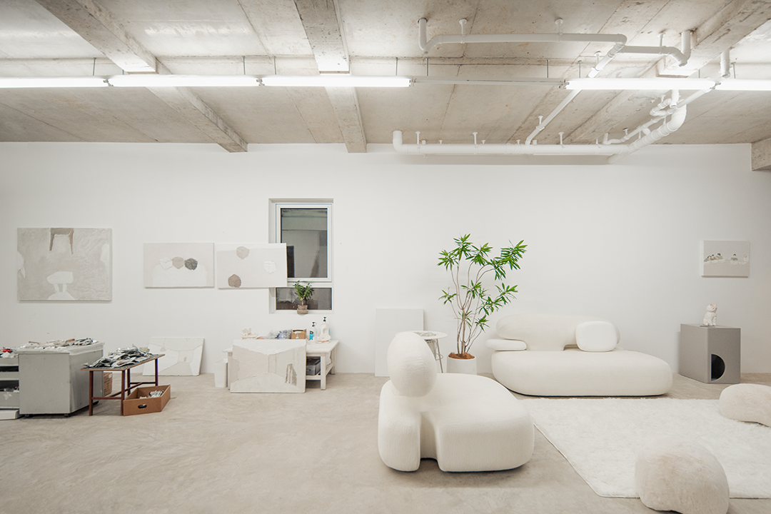室内则是大片的白墙和清水泥,集展厅、工作室、社交及休憩等功能为一体,最大化伸展作品被包容的可能性。