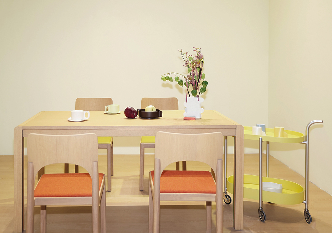 采用了彩芯桦木多层板的Wafer Table、多种坐垫的Arch Chair、以及雏黄色Tail Trolley,不同的材质与色彩交汇为一个温馨的餐厅。产品周身无处不在的圆弧设计彼此响应,营造出流畅、灵活的生活氛围。