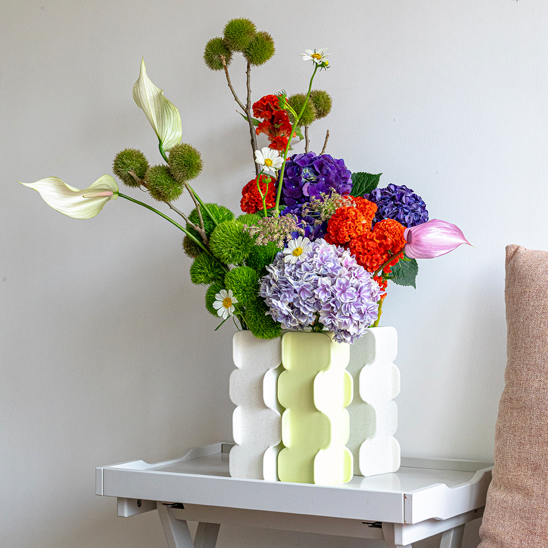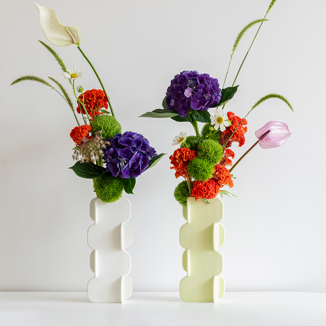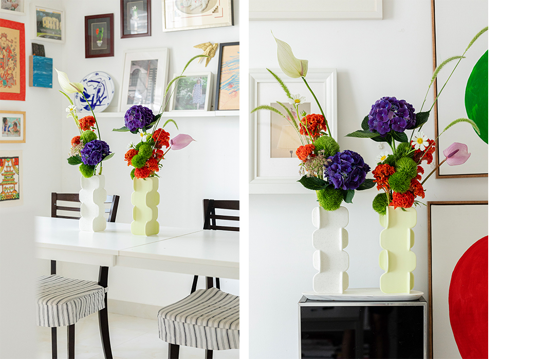 初见Puzzle,他便觉得要拥有2-4个才能充分展现其趣味之处。此次花艺创作,他选用三个曲奇白色与一个薄荷绿色组合,以这种不对称的配色,打破花器方正造型带来的固有稳定感,让花艺更加自然地散落呈现,带来拥有独特个人风格的家居装饰。