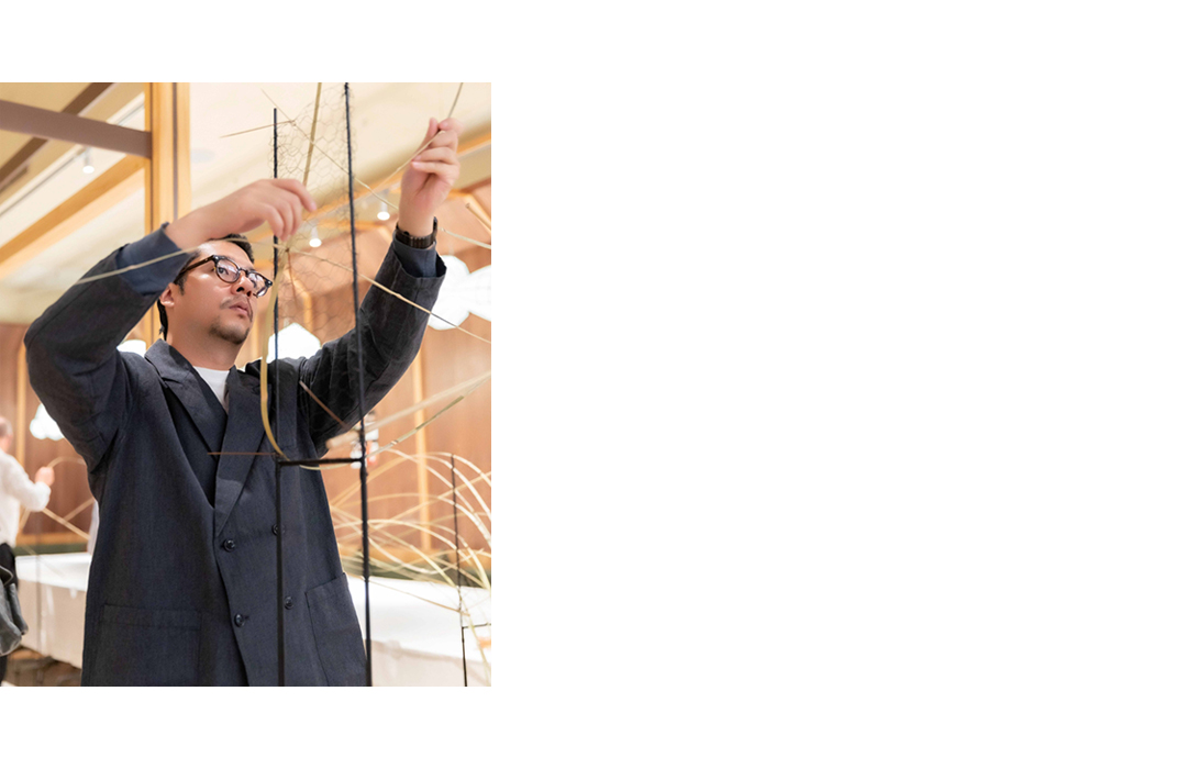 在2025年3月的XC SHOW现场,西瓜还没吃就被拿来当花瓶,枯枝来自绿化带,而器皿从现场借得。Hans在完成作品之后,又带着作品寻觅合适的“台面”——直到遇到了间则的Wafer Table。放置之后,当场拿剪刀修剪了一下柔丝,落在桌面上形成了一个完整的圆形,众人都觉得这样不错,一种奇妙的情绪便被保留了下来。