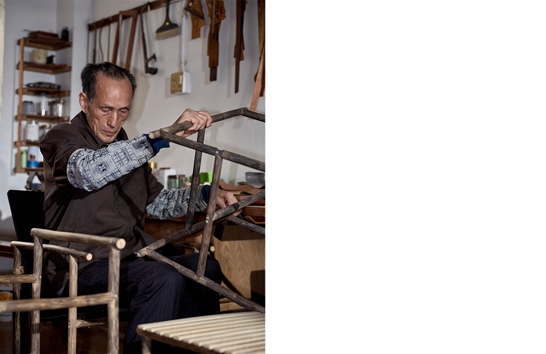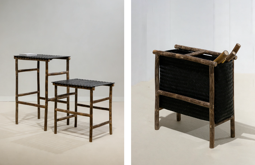 在与竹艺大师王荣龙的讨论中,团队发现了区别于空心竹的实心竹——棕竹(Zong Zhu)。这种竹材表皮之下有明显的纤维芯,为家具制作提供了全新可能性。木工艺大师印洪强基于棕竹的特性,以榫卯等传统工艺让不同部件巧妙连接,达成理想的结构效果。2024年,间则与竹编大师胡正仁展开合作,探索中国传统竹编工艺与现代设计的新结合。