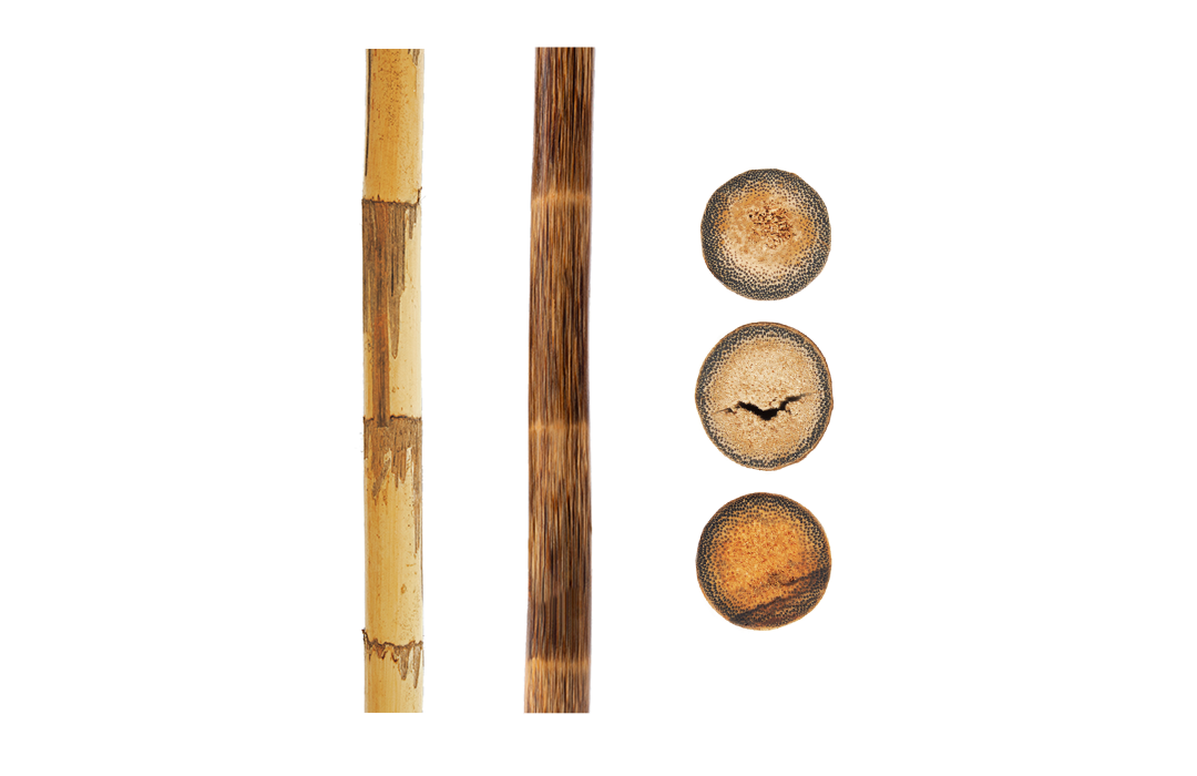 棕竹在剥皮加工前后的对比、截断面露出的纤维芯