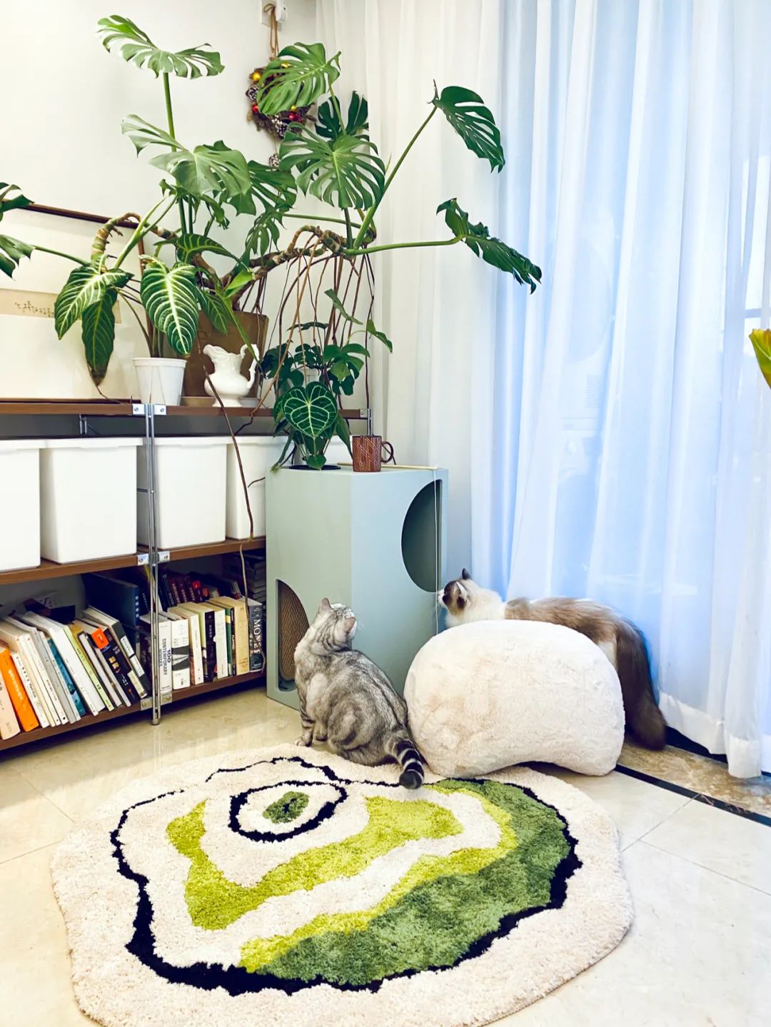 我还在家的一个角落,用间则的Jenga Cabinet猫柜和Pat-Pat座墩打造了一个人、猫、植物共用的读书角,下班可以坐在这里,放空自我、惬意享受。