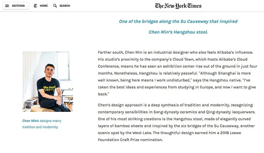 2012年,从荷兰埃因霍芬设计学院毕业归国的陈旻创办了Chen Min Office,先后为SWAROVSKI、NIKE、LOEWE、Starbucks、Veneta Cucine等全球知名品牌提供设计服务。2018年,The New York Times《纽约时报》在专题 “HANGZHOU:Ancient City with Electric Dreams”中报道了陈旻的设计故事和他的工作室。