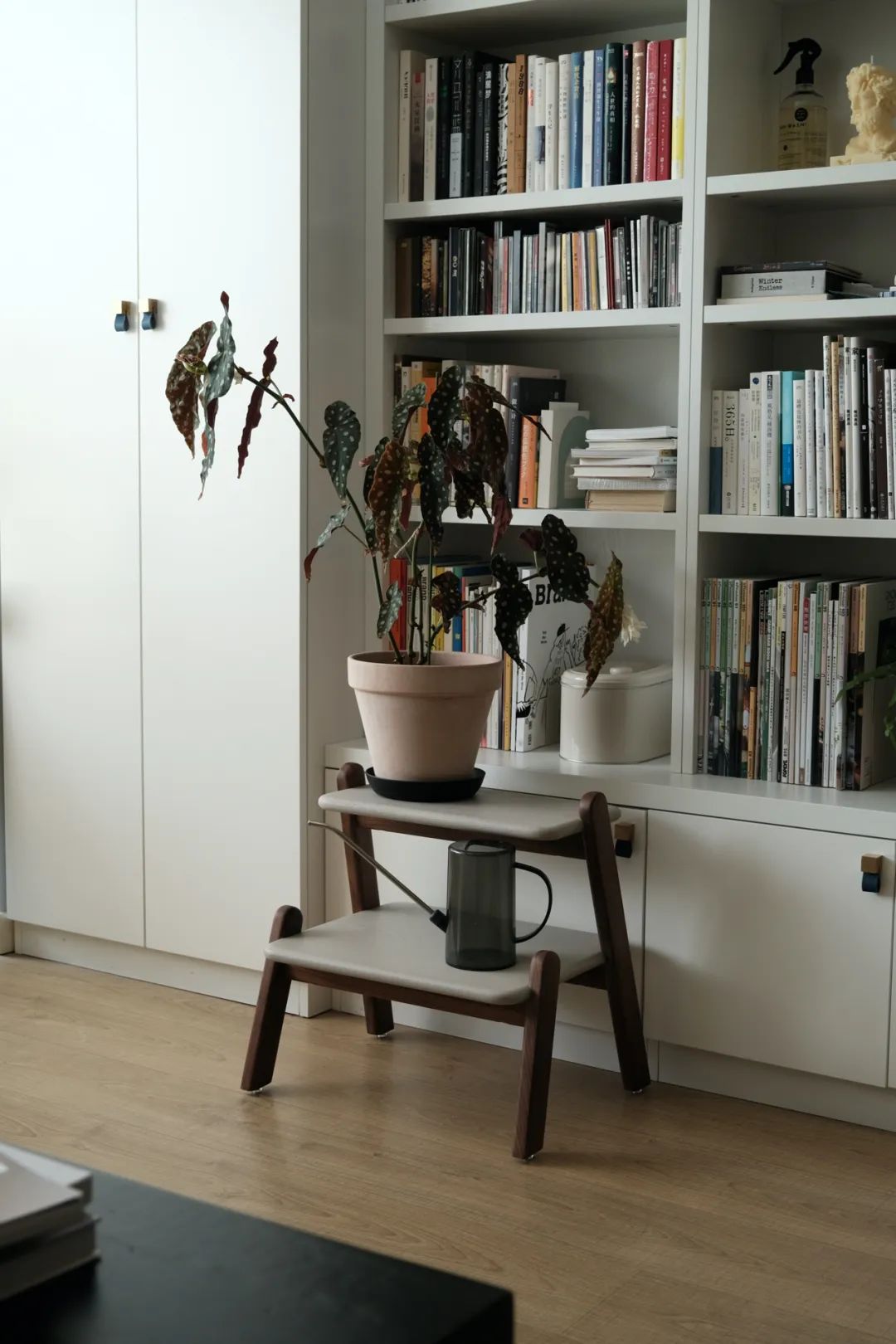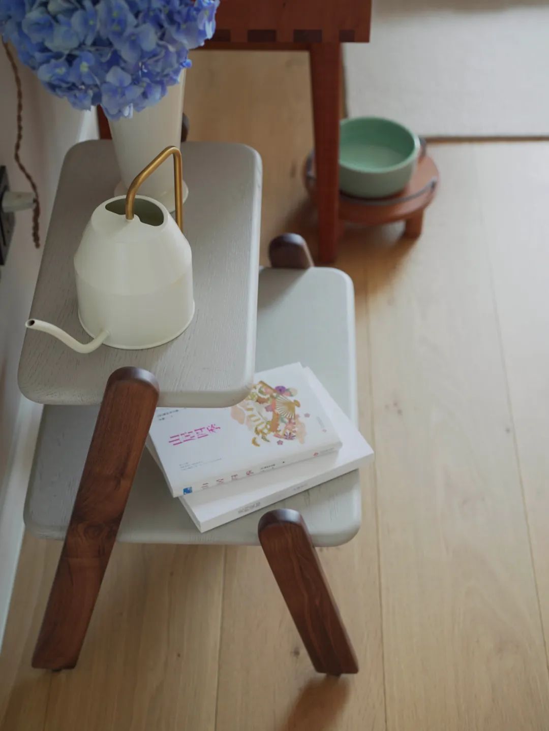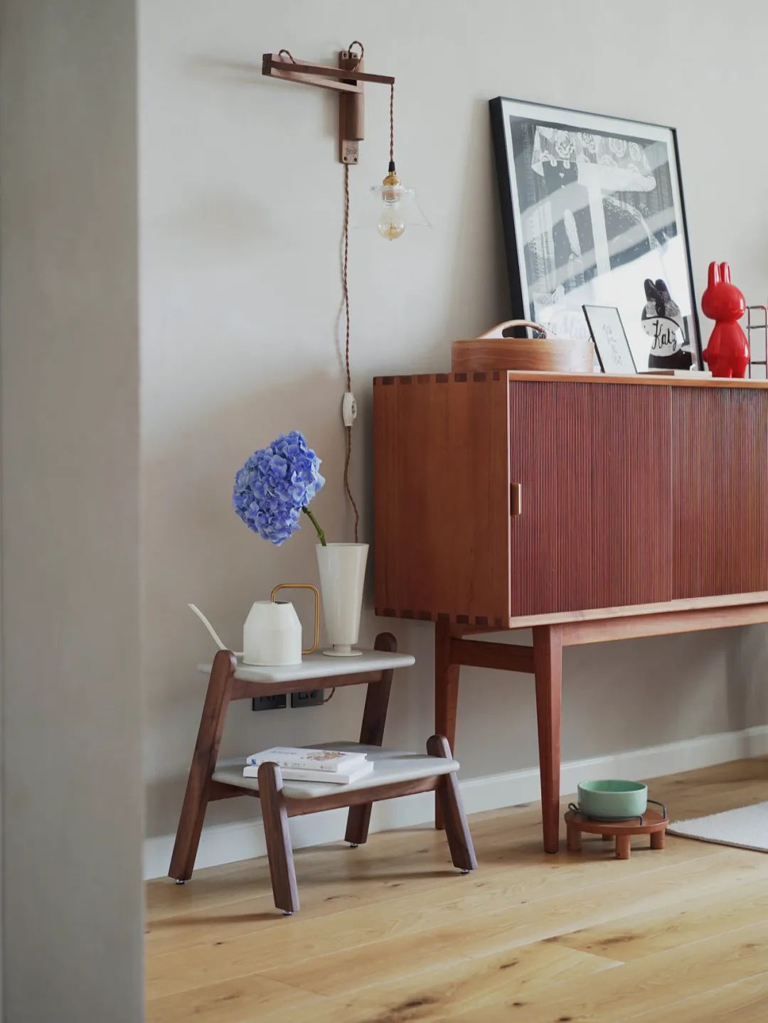 家中新入手的间则PONY不仅可以当脚踏凳,也可以当边几,实木打造扎实稳且颜值高,与她家的风格完美融搭。