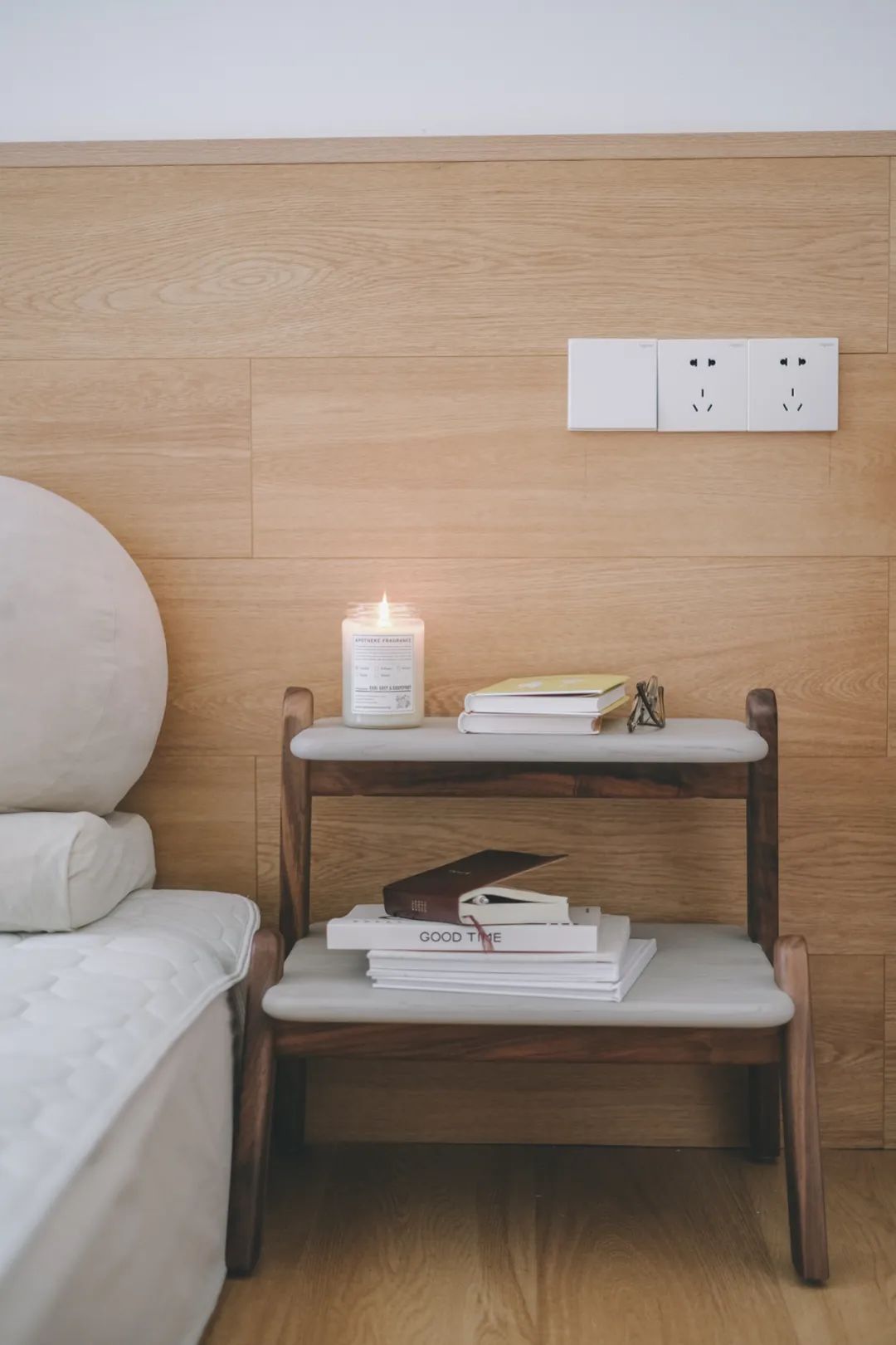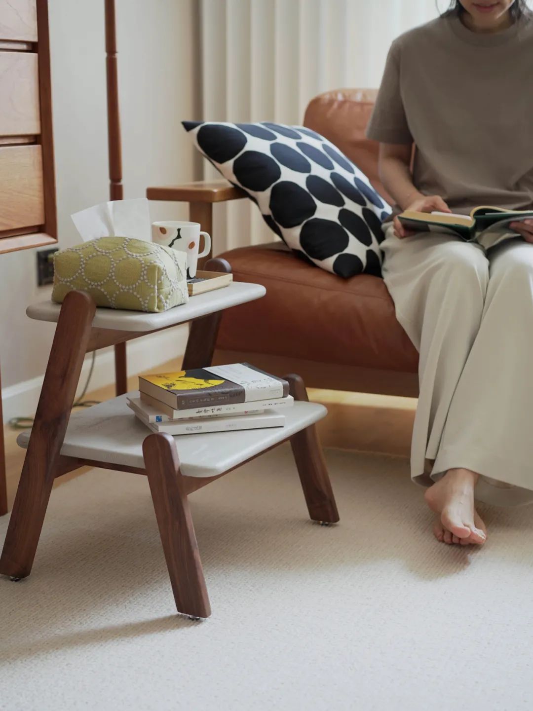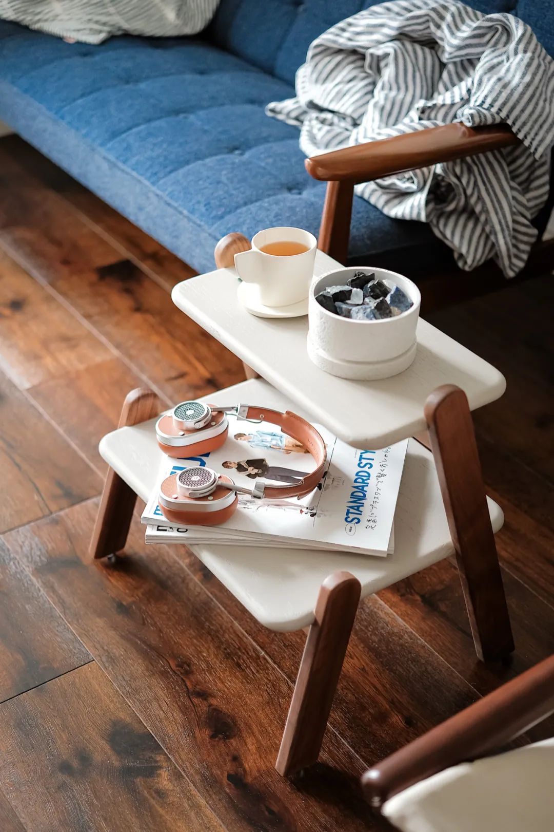 家中新入手的间则PONY不仅可以当脚踏凳,也可以当边几,实木打造扎实稳且颜值高,与她家的风格完美融搭。