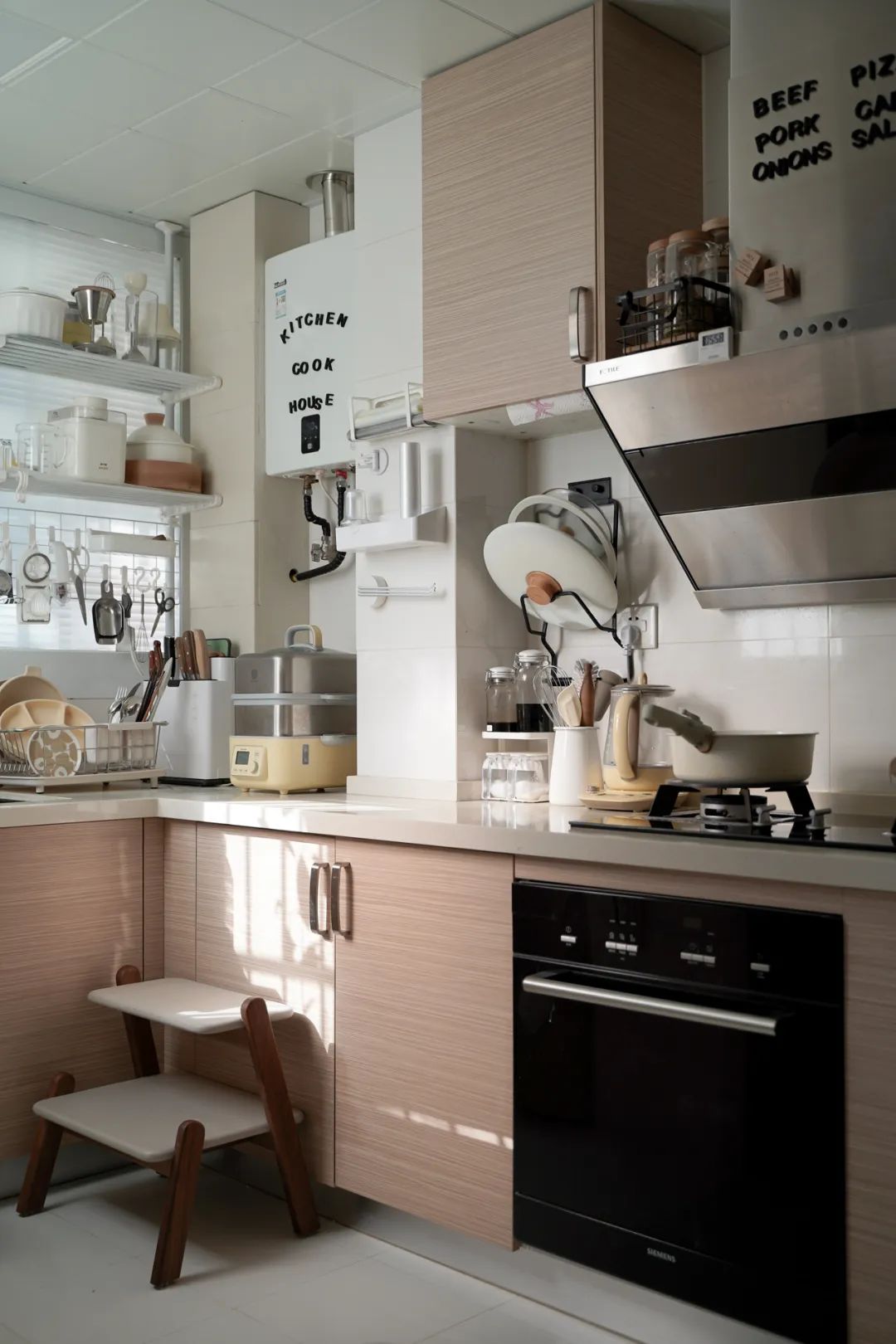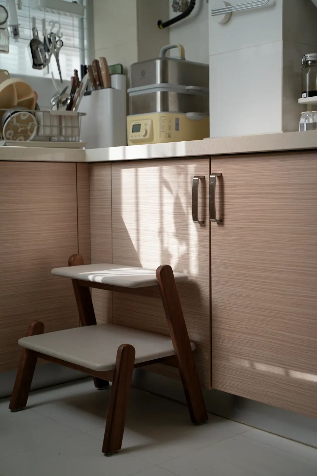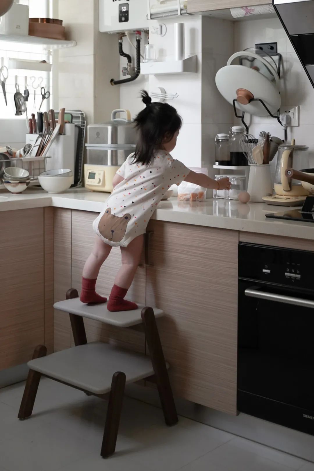 “用了五年的小厨房,对我来说还是好喜欢,甚至动线已经磨合到闭眼也能做出一餐饭。PONY凳几买来是想放植物用的,现在变成女儿的小梯子,女儿很喜欢站着上面和我一起做饭,凳子很稳,是榫卯工艺连接,所以给她用起来也蛮放心的~而且我发现它侧面也设计的好好看!”
