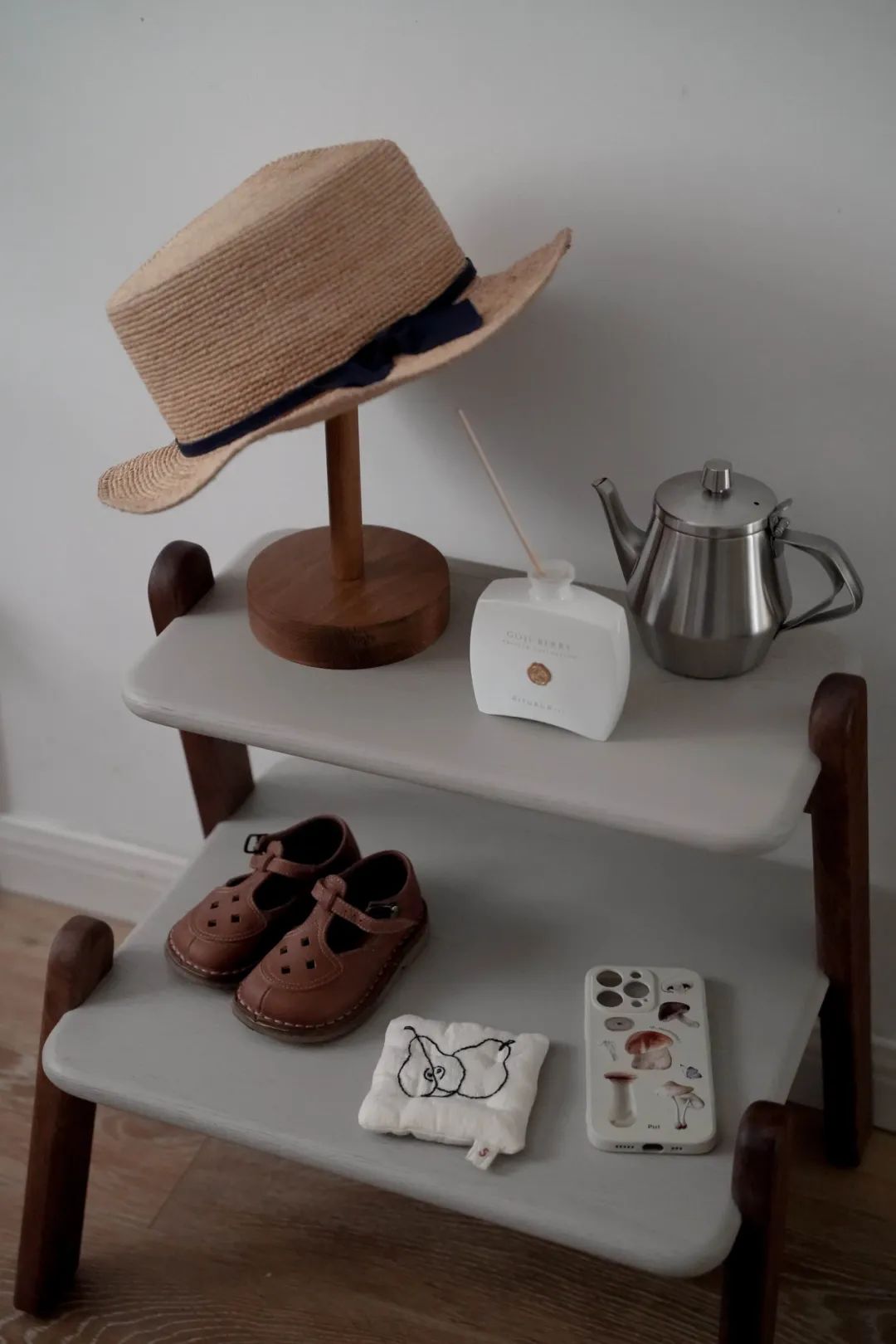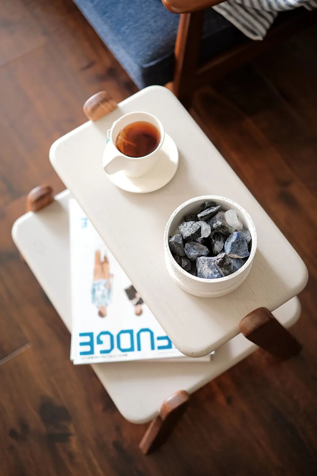 新入了间则的小凳子和杯子,考虑到可以给女儿用来做登高凳,平时还可以当个边几或者置物架非常实用。”