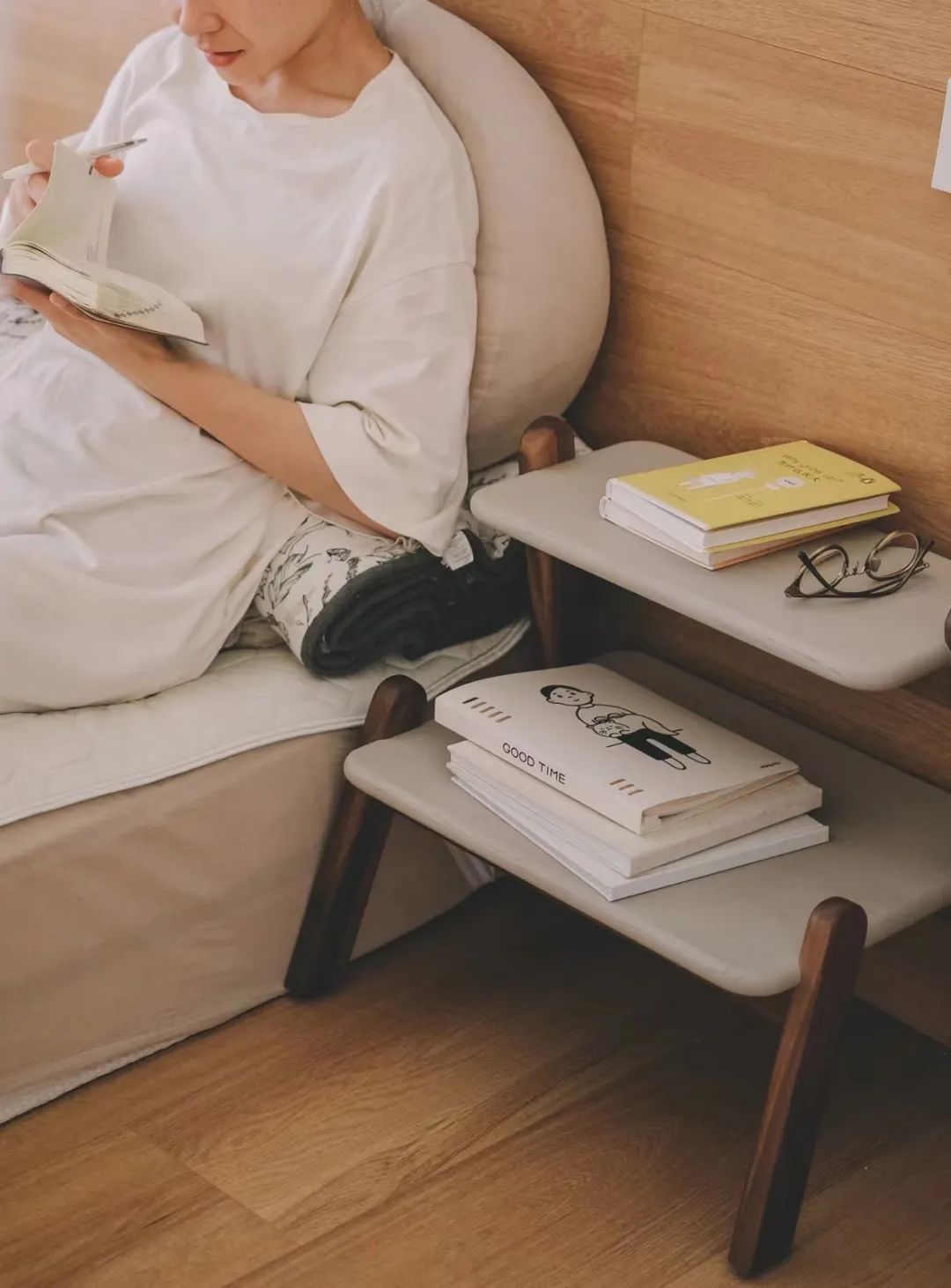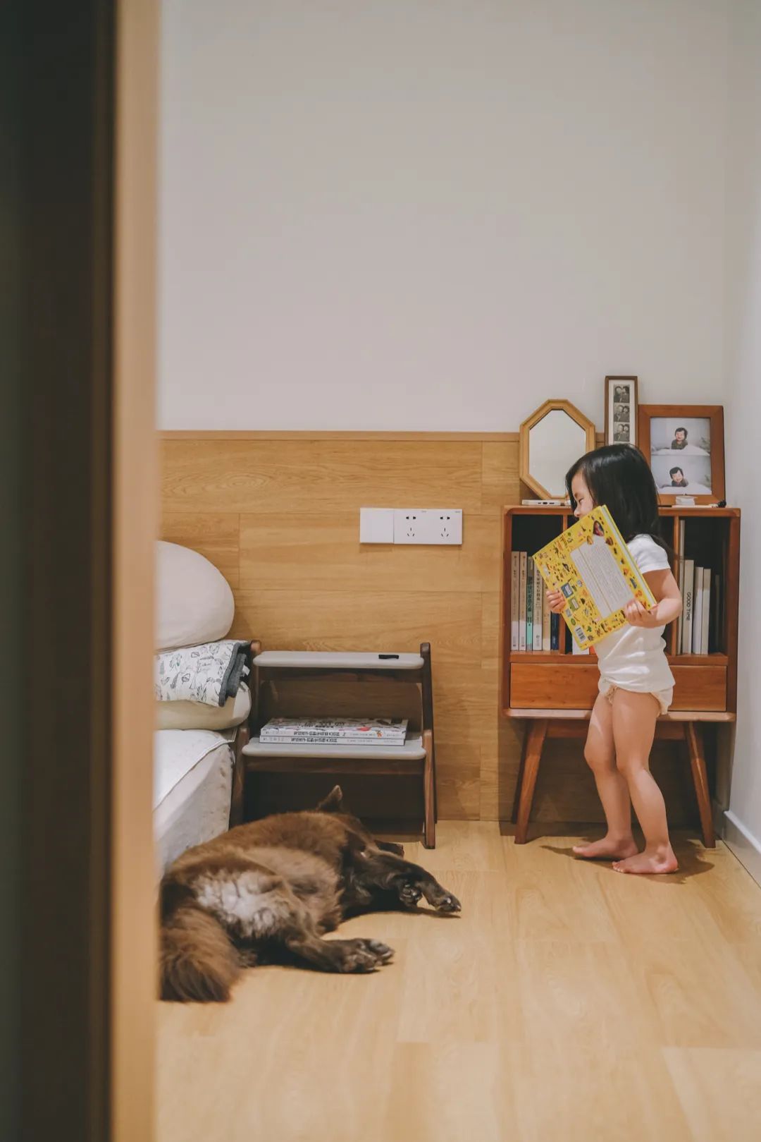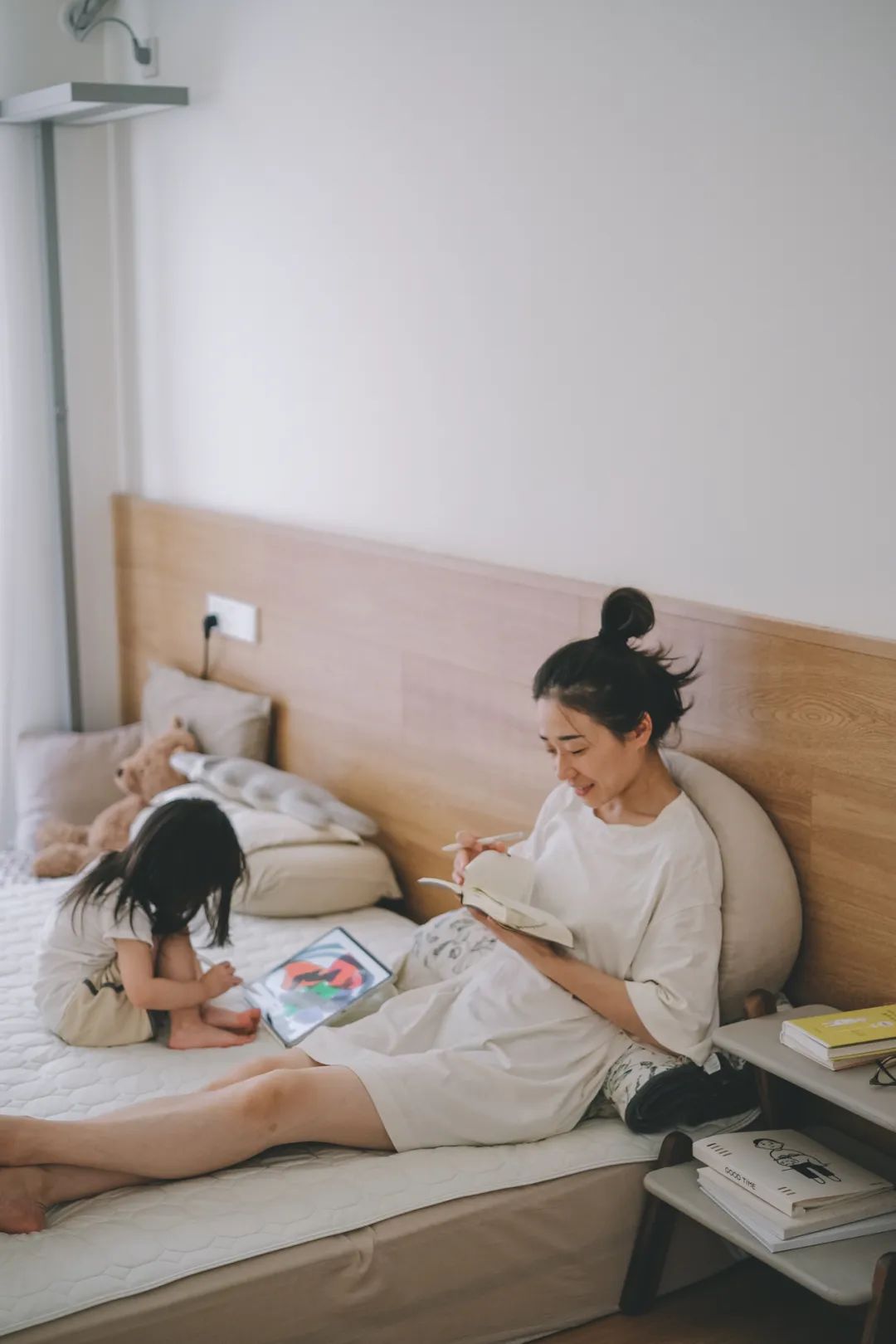 卧室床头的一平米亲子阅读角,是她和女儿的睡前小空间,床头边放了适合她拿取高度的书柜,又加了一个PONY小凳几,平时可以放一下手机和经常看的书,需要的时候搬到旁边衣帽间作为脚凳。她在这里写日记读书,女儿在边上画画看绘本,不打扰彼此又可以随时互动。