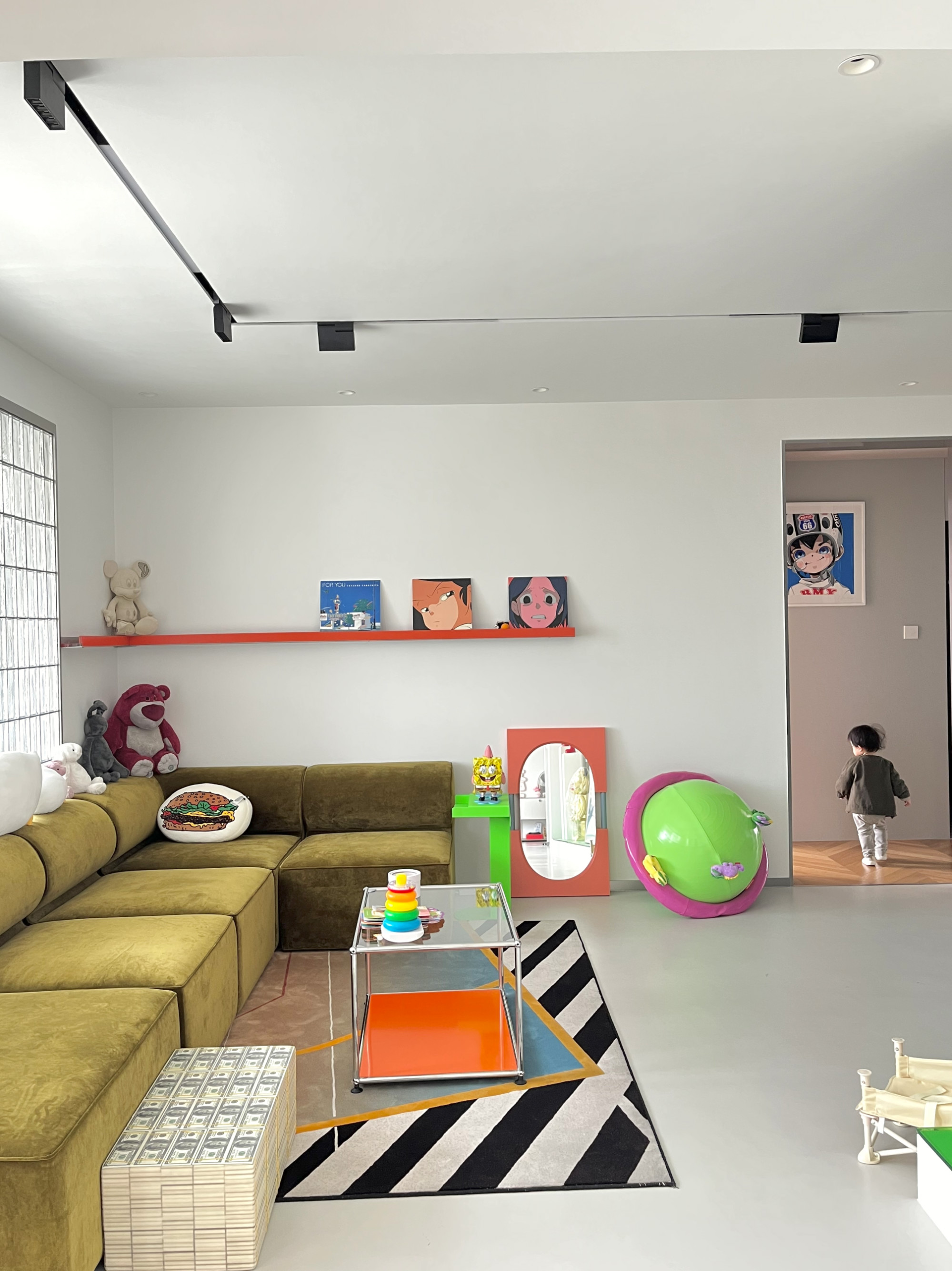 五福酱称自己的家是「人类幼崽的快乐星球」,孩子每天大部分时间都是待在家里,所以她尽可能给她一个多彩、有趣一点的玩耍环境,但又不打破家里原来的风格,完全低龄化。