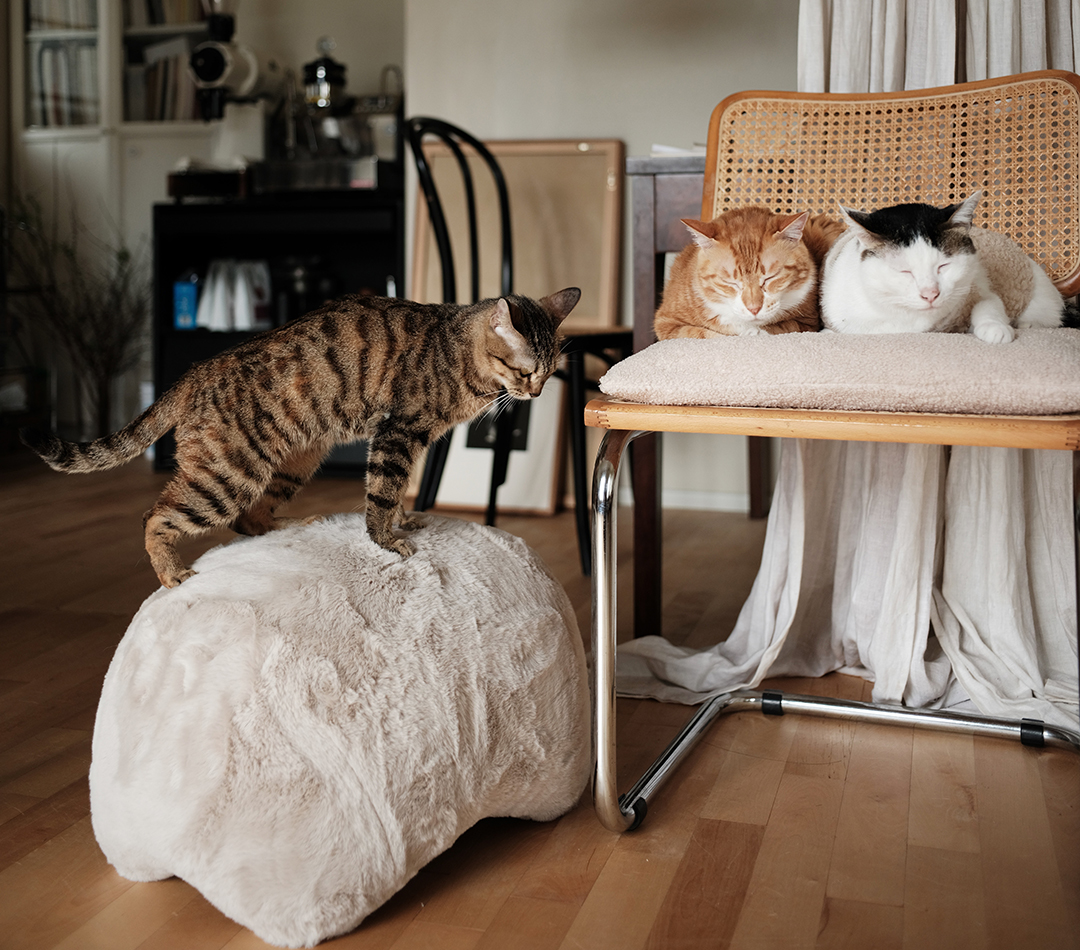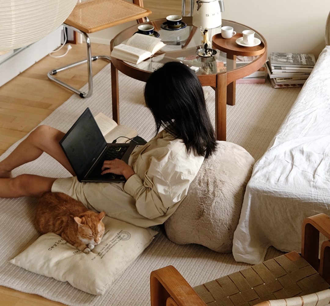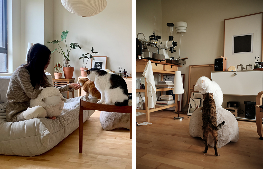 池鱼上班没有明确的时间限制,起床以后开咖啡机、洗漱、吃早饭、看一会儿手机,安排前段时间攒下来的工作,所有的活动都有猫伴随。在线访谈中,猫一直在她身旁粘人“念叨”。