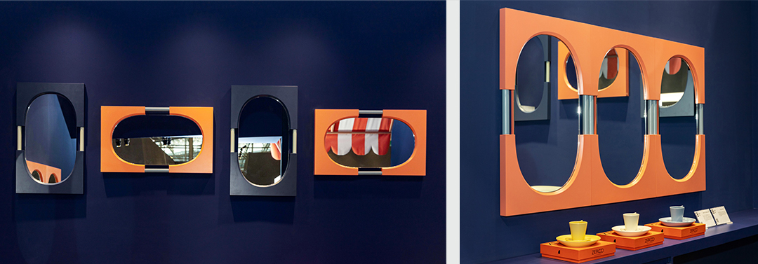 墙壁两侧悬挂着以符号「0」拉伸而成的Noon Mirror,以横竖相间及无缝并排两种壁挂组合,展现多面镜像在空间中的奇妙润色。