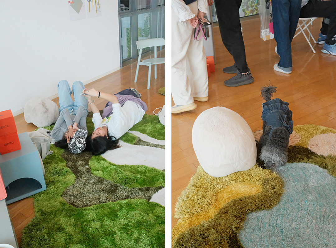 软萌可爱的Pat-Pat Stool们是这次乐园的吉祥物,正在太阳底下烘晒憨厚的毛绒身体,亲肤仿兔毛面料之内置有实木框架与高回弹定型棉,为来往休憩的读者们提供稳定支撑以及小动物般的温暖互动。