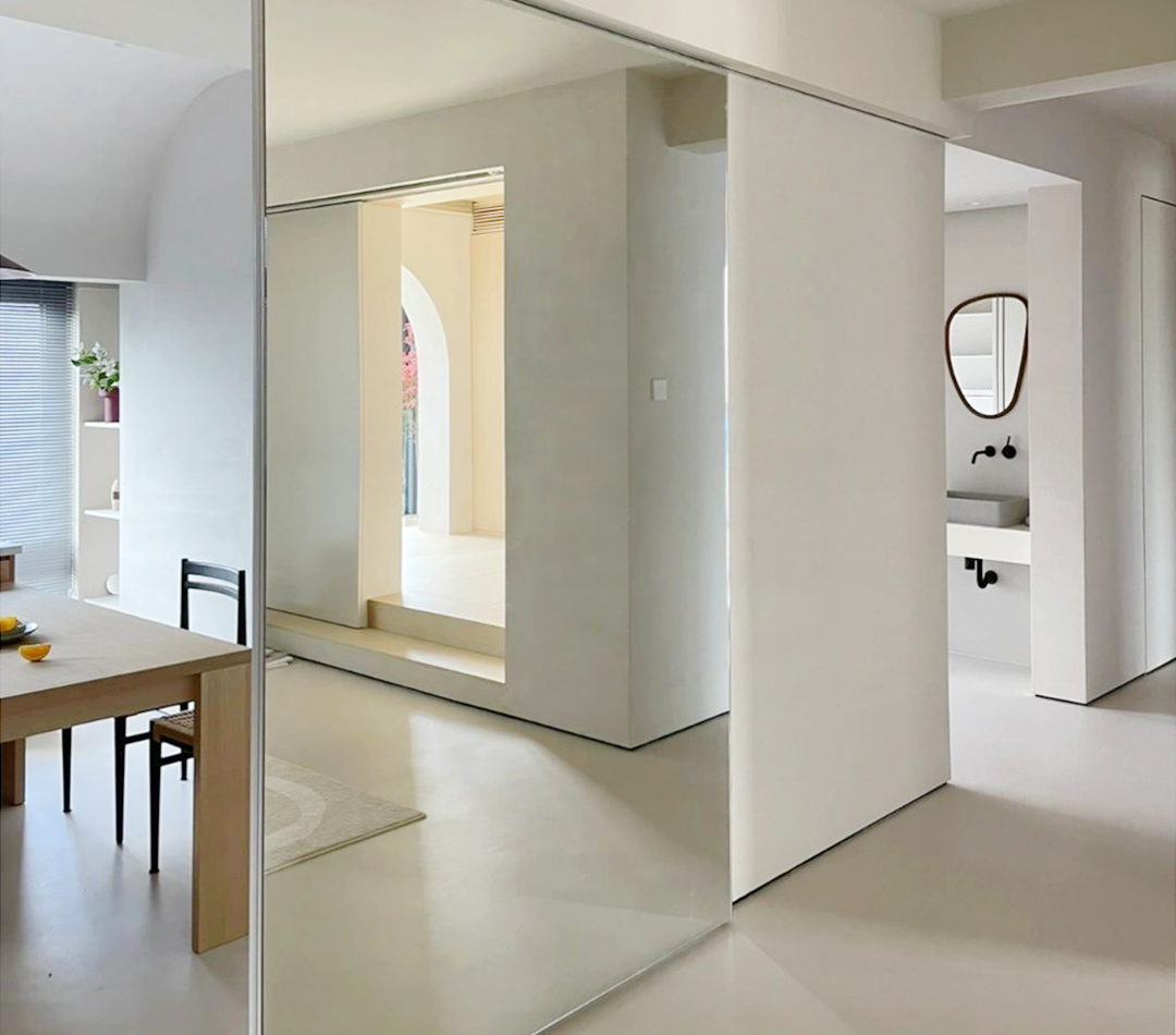 比如我们喜欢跳舞,需要在客厅里有一整面大镜子。和设计师提了这个需求,最后实现得也挺巧妙的,在开放式厨房和客厅之间加了移动门。推移之间,镜子闪亮登场,点燃香薰,播放音乐,客厅瞬间变成了充满情调的舞厅。