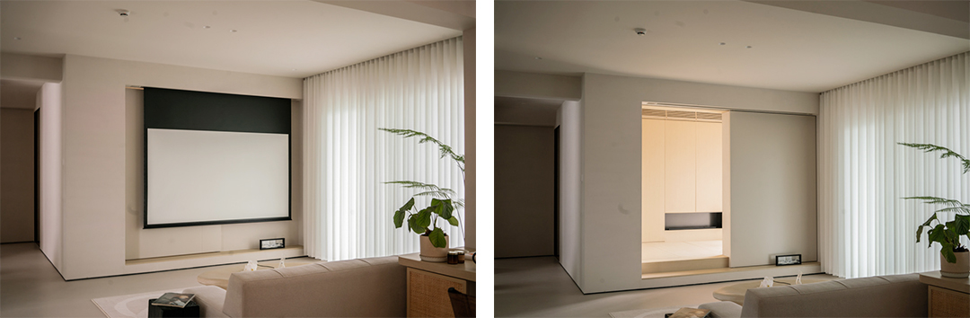 A:这是一个无名的榻榻米房间,入口在本来的电视墙位置。合上门可以变成封闭空间,颜色统一的客厅,一进门就特别舒服放松,放下投影就让客厅变成了电影院。