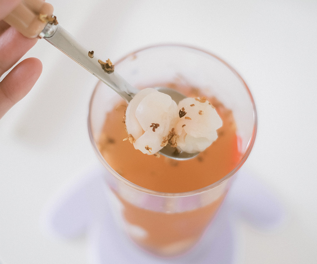 泉水浸泡的白茶提前冷藏,经过一晚慢悠悠地释放,清香弥漫于水,扑鼻展开。碾压过的荔枝,清甜的果汁更能尽情释放。置入冷萃白茶,再加一颗冰球,为果肉和茶汤保鲜,可令其中交融的滋味,一丝一丝,缓缓展露。