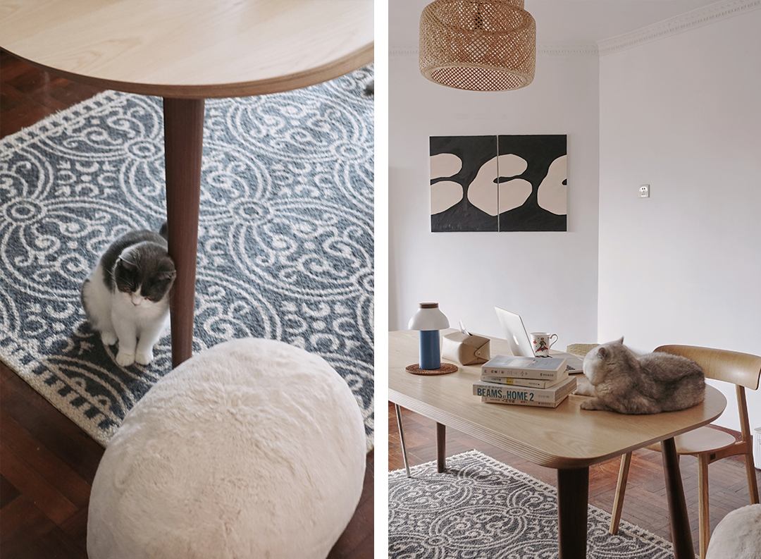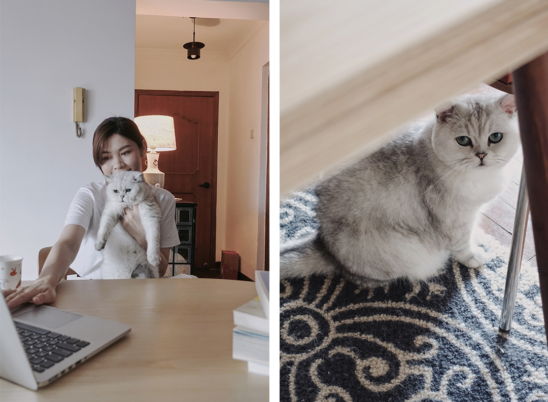 猫有时候会像个小朋友,趴在你身上不愿意下来,又或者是默默躲在餐桌下看着你,偶尔来帮助你专注工作(抓你敲键盘的手)。