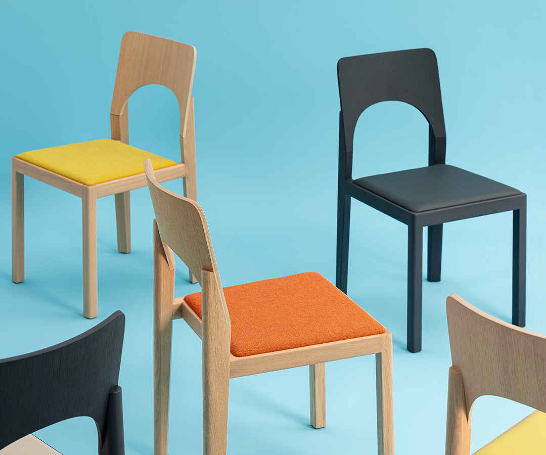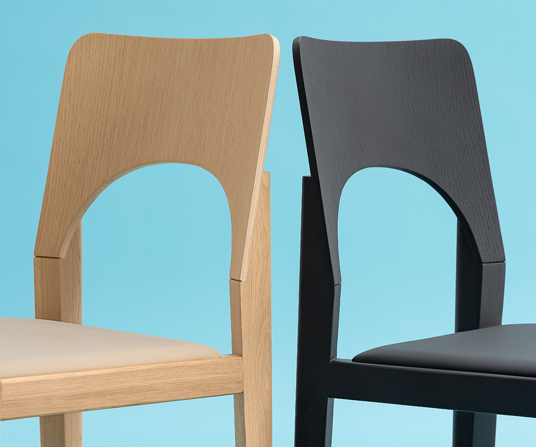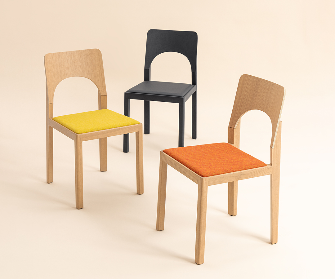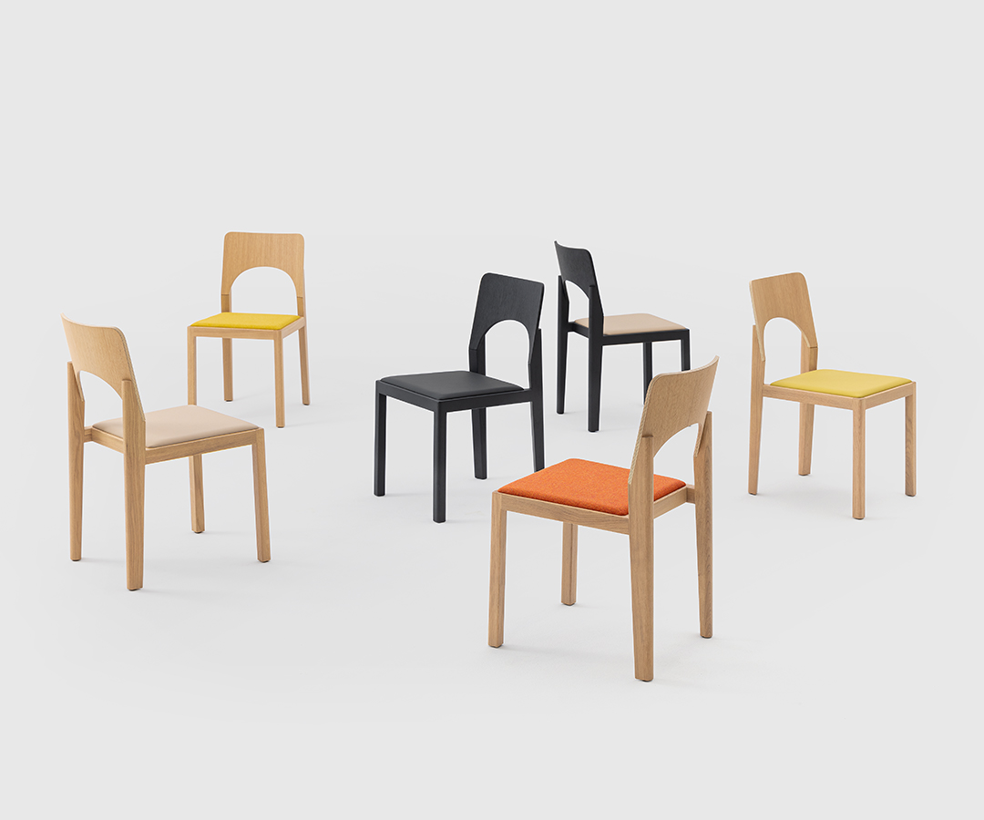 造型灵感来自方圆结合的拱形结构,稳定的形态常常支撑着门窗与通道的存在。通过在椅背留出拱形的切面,设计师把纵向延伸的建筑视感,嵌入到一把轻巧的椅子之中。