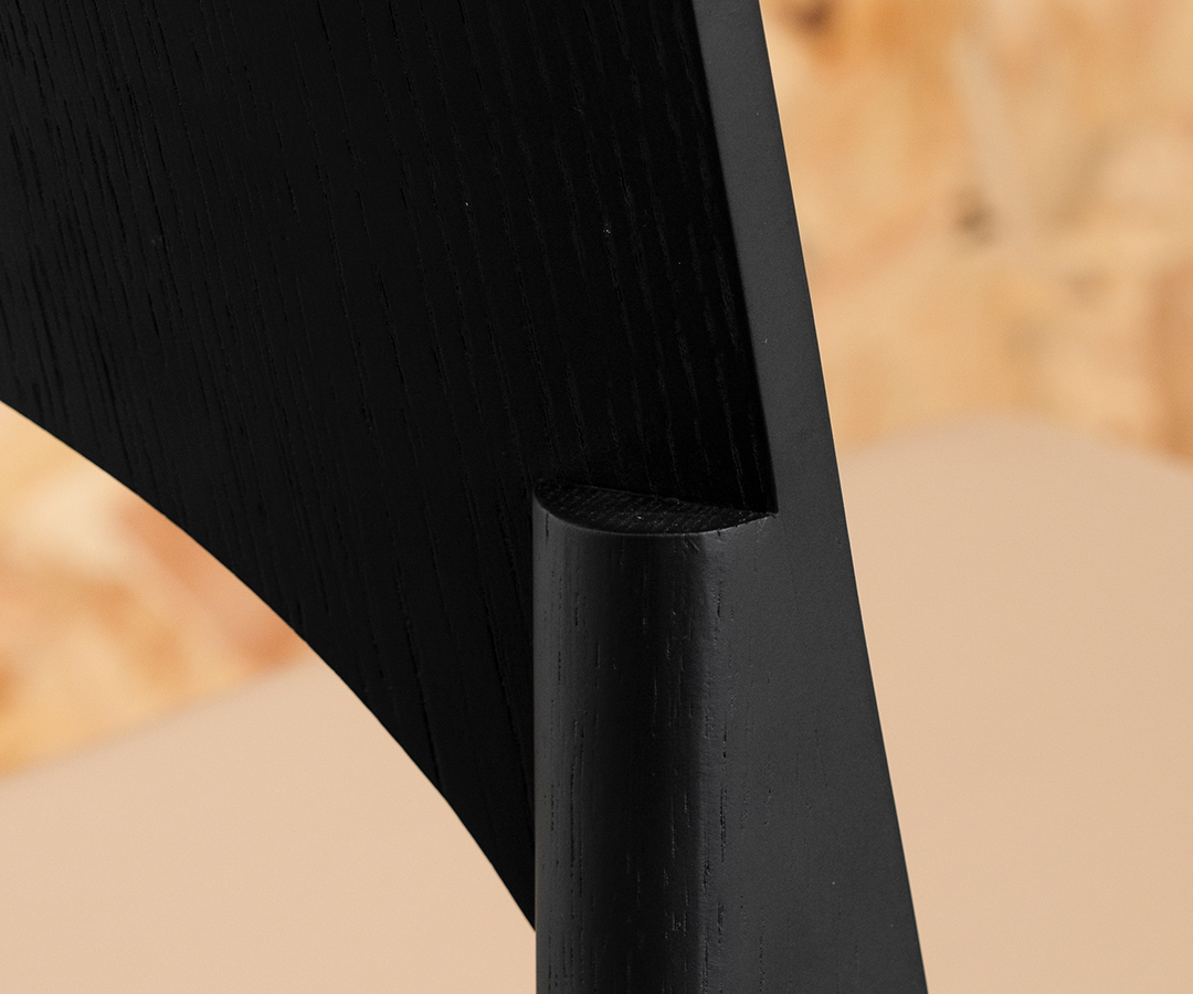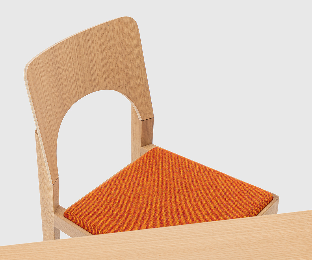 椅子的视觉聚焦于拱形的留白区域,减轻了整体的体量感。明快的直线交汇之处,以圆弧来收口,让方正的造型显得灵巧。日常使用时的接触面,均作有立体的圆润设计,以降低磕碰的可能性。