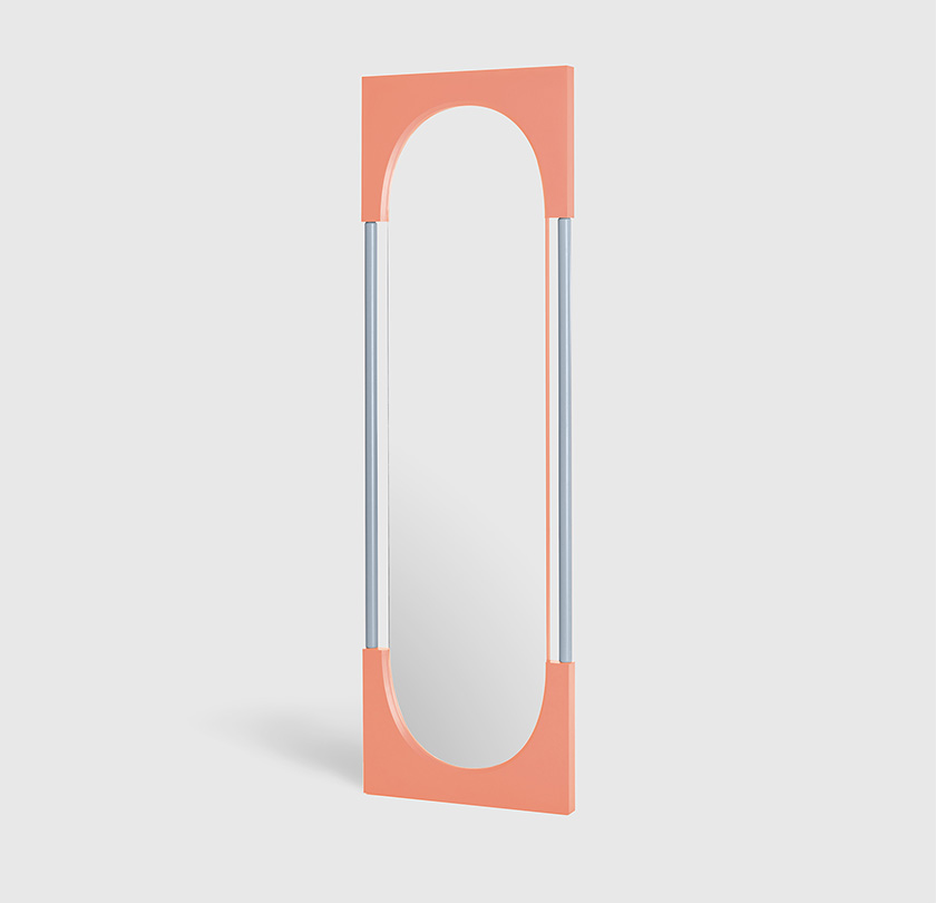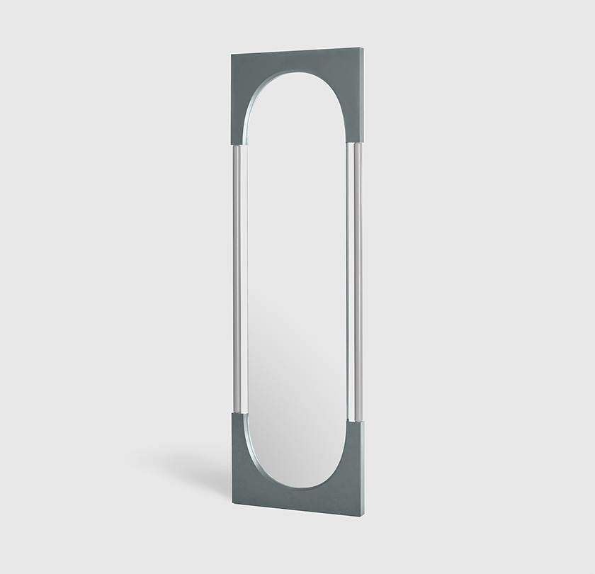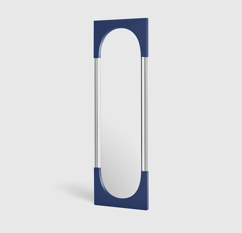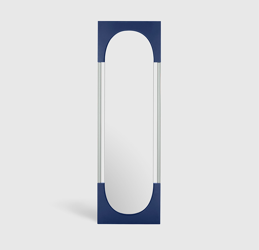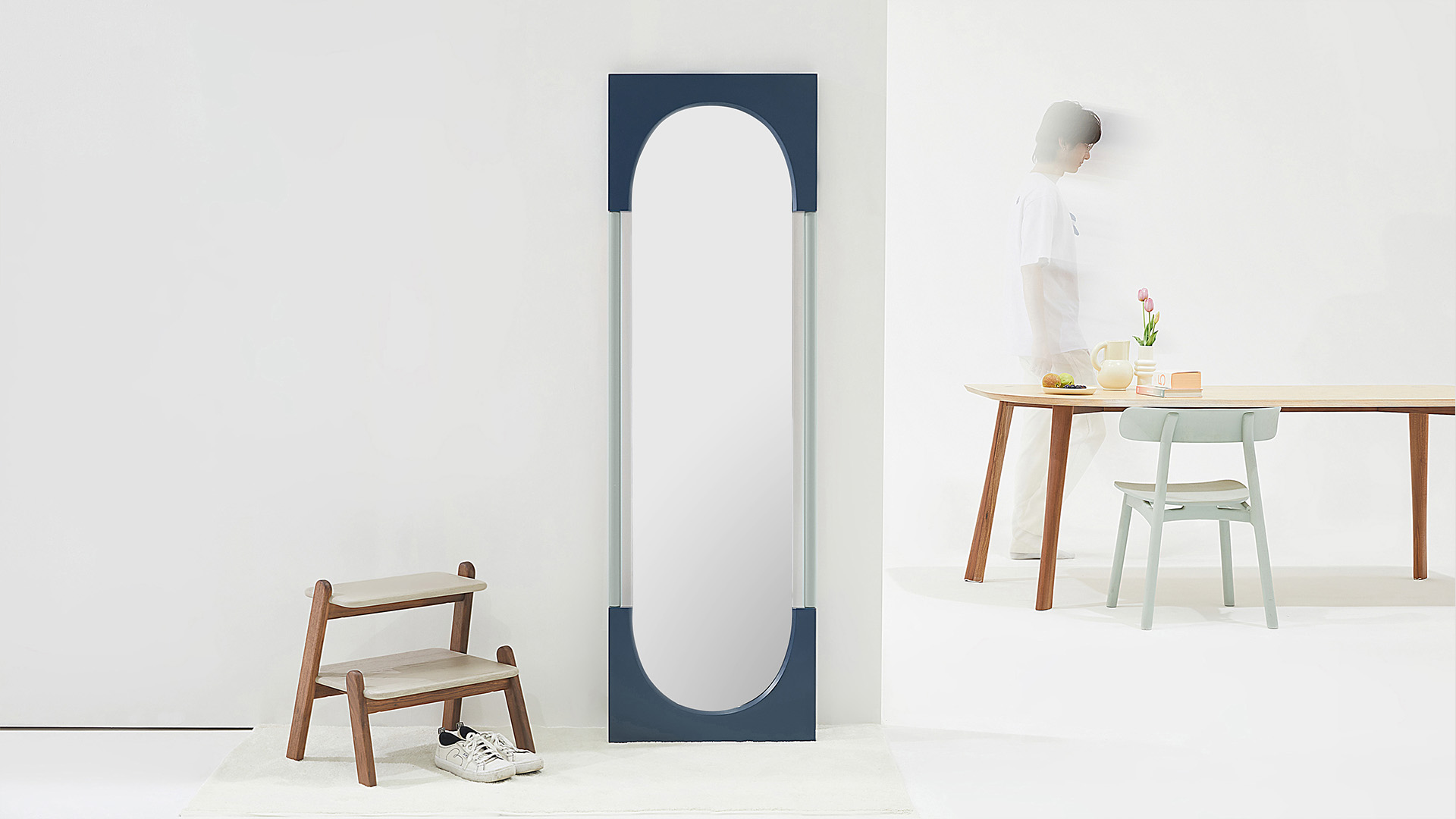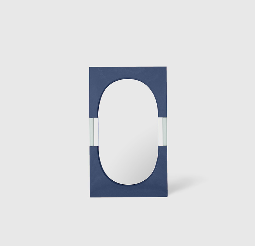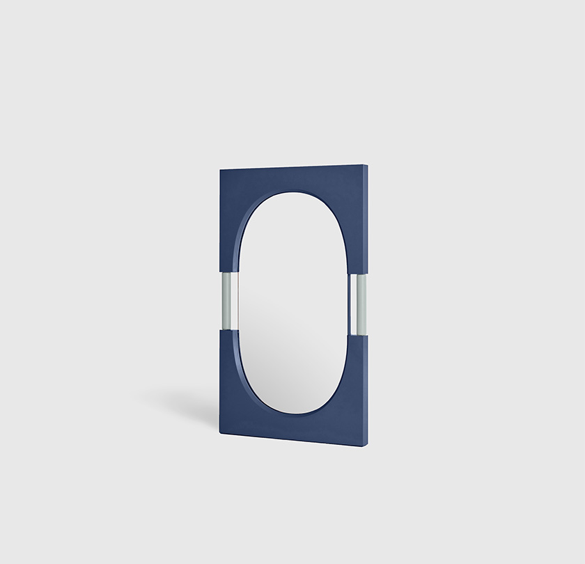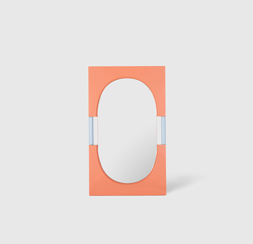 将品牌的标志元素「0」拉伸作镜面,置入单纯的几何形态构成的外框中,温润的木框与清洌的镜面制造出轻微的冲突感,再调入醒目的色彩,在功能与装饰性中取得微妙的平衡,折射出主人的迷人个性与优雅趣味。