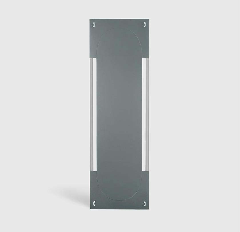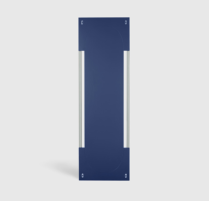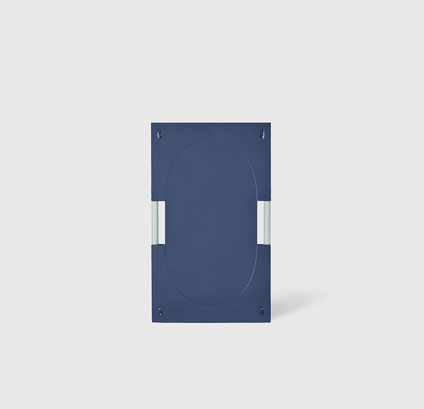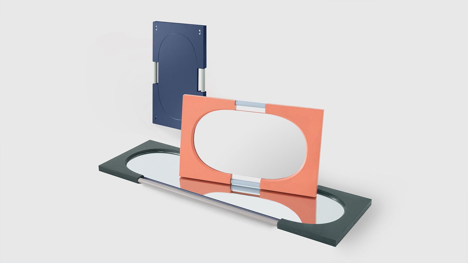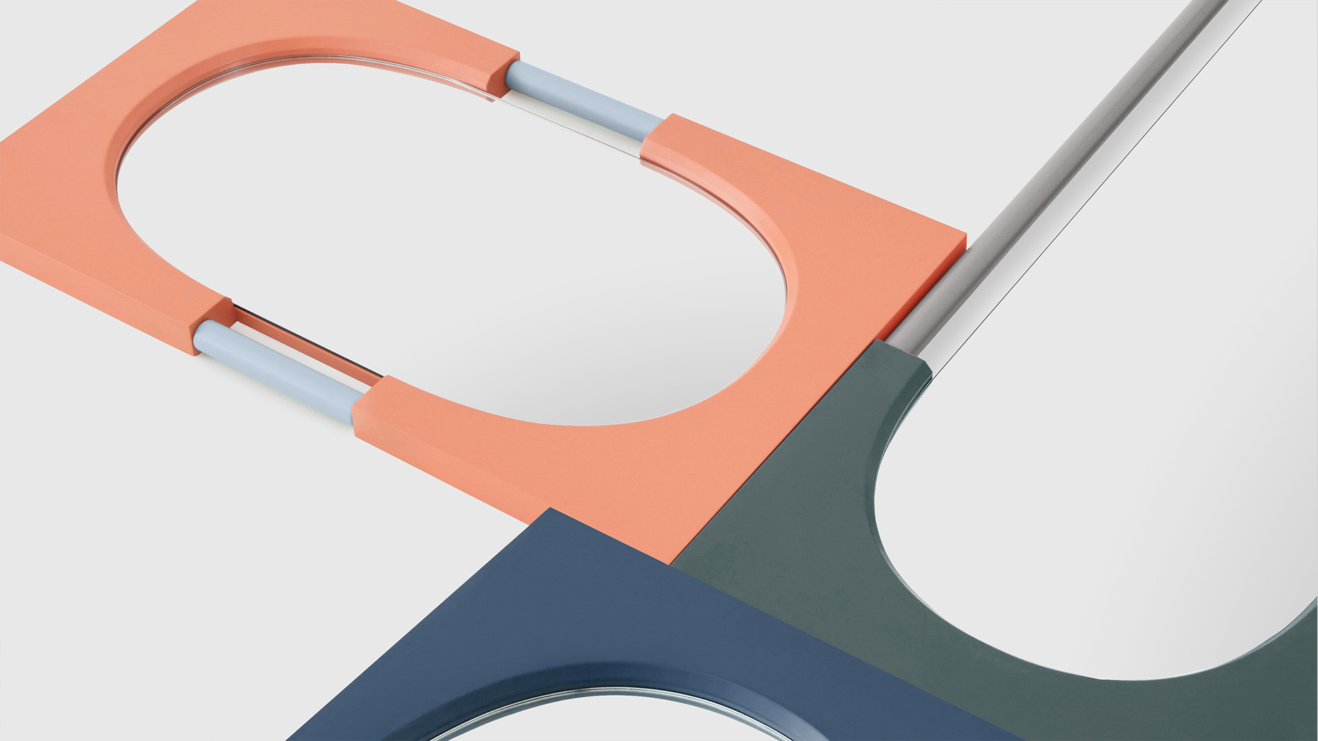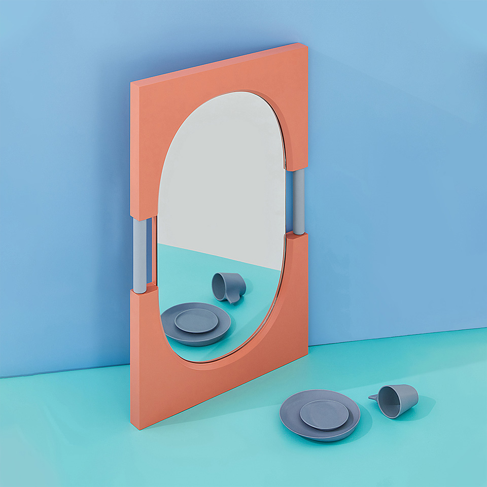 将品牌的标志元素「0」拉伸作镜面,置入单纯的几何形态构成的外框中,温润的木框与清洌的镜面制造出轻微的冲突感,再调入醒目的色彩,在功能与装饰性中取得微妙的平衡,折射出主人的迷人个性与优雅趣味。