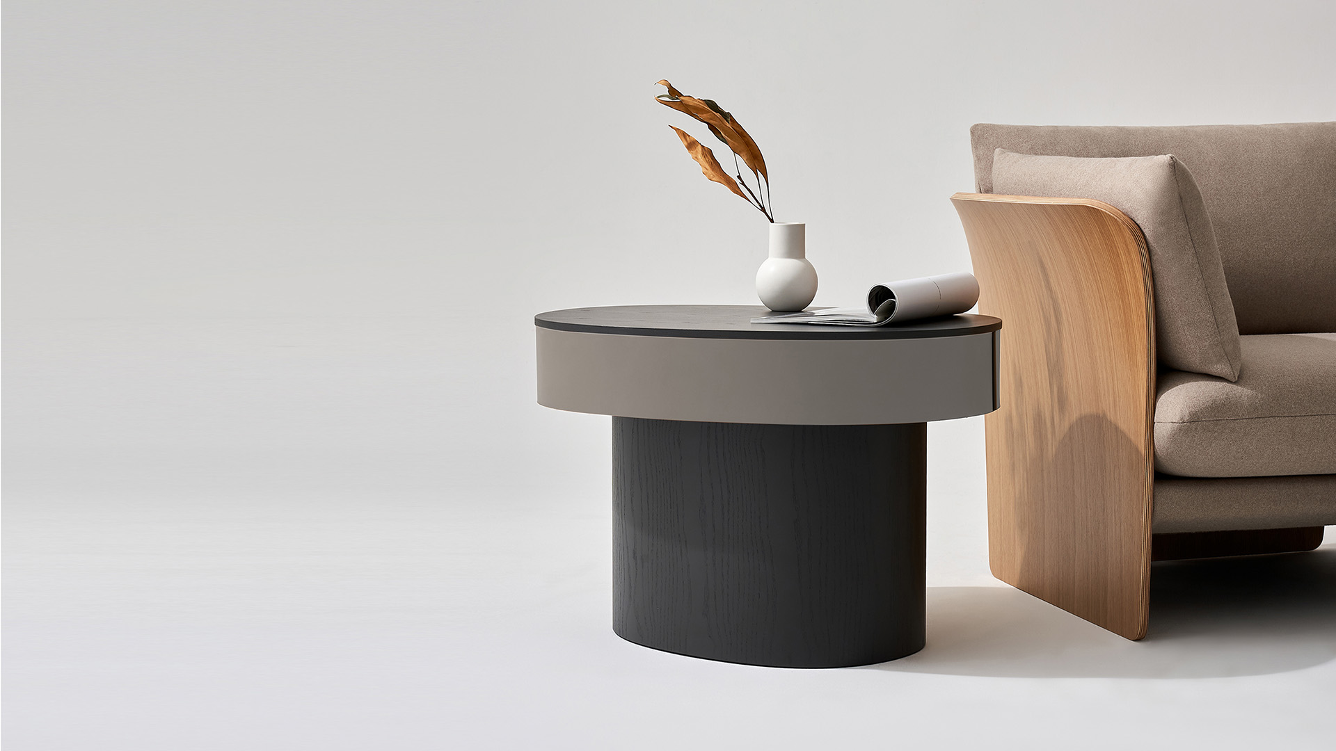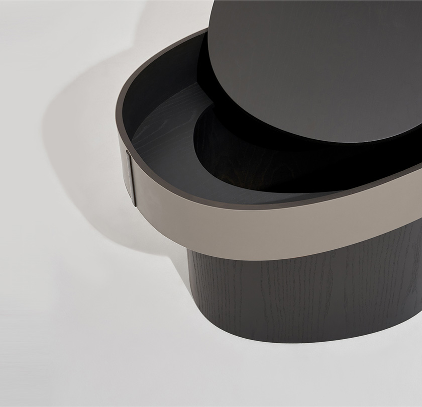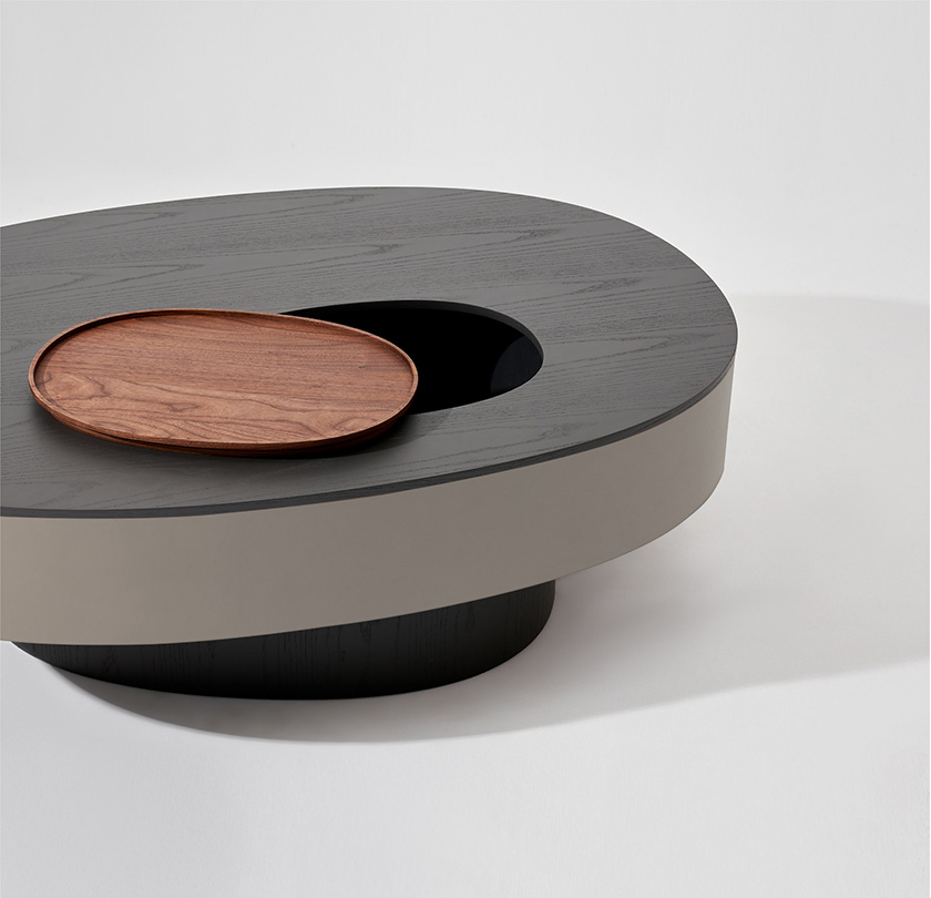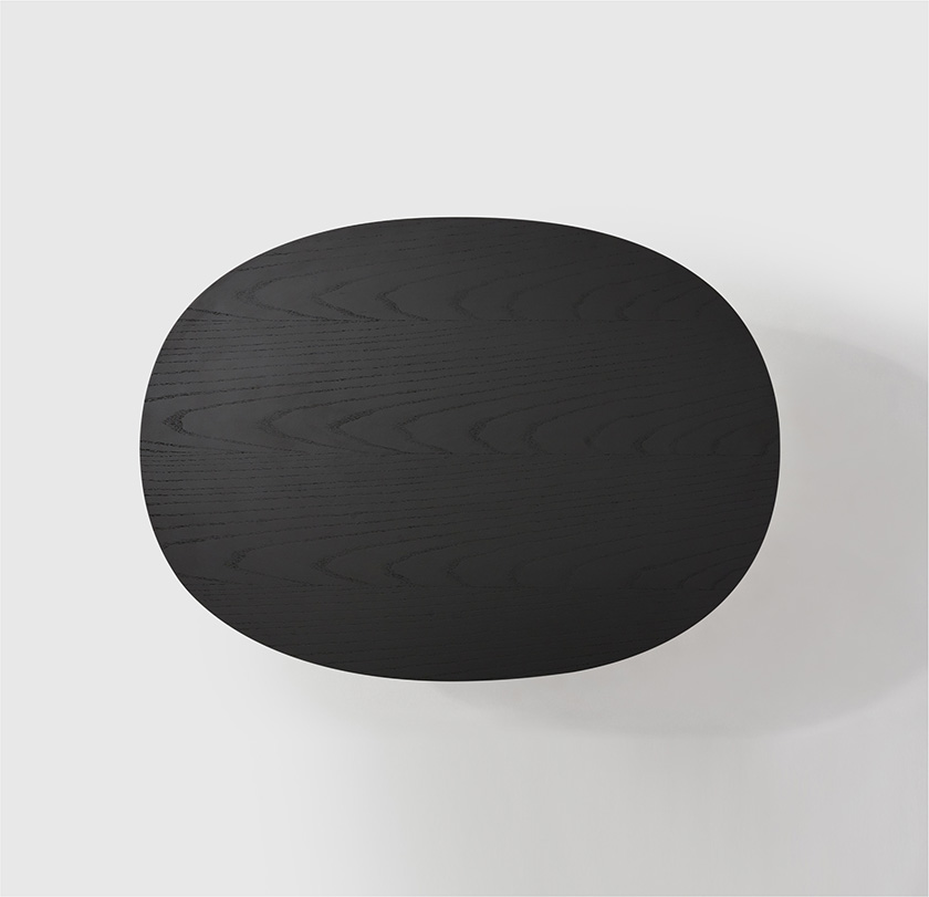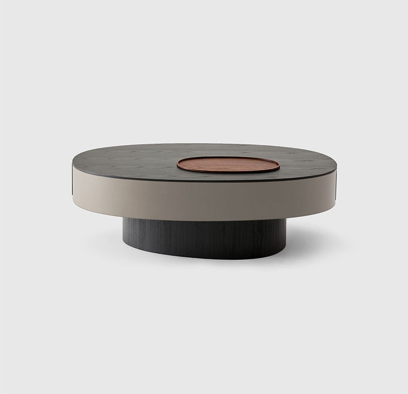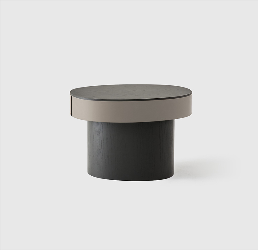 一个由 0 的形态生长而来的咖啡桌系列,桌面与桌腿错开20°,简洁的外形中带有自然的理趣。三种高度和桌面尺寸构成实用的承载--收纳组合,同时为空间注入层次感,亦可作为边桌、床头柜等单独使用。
