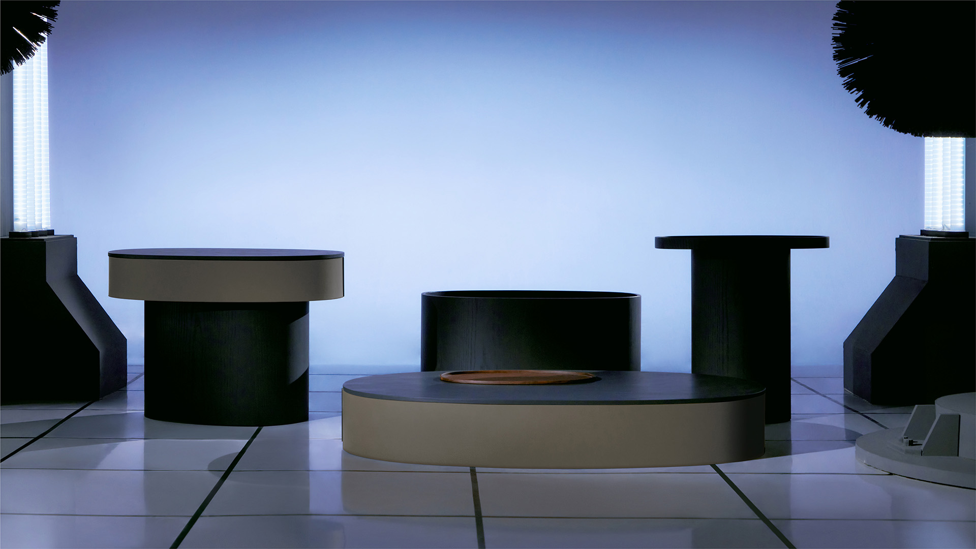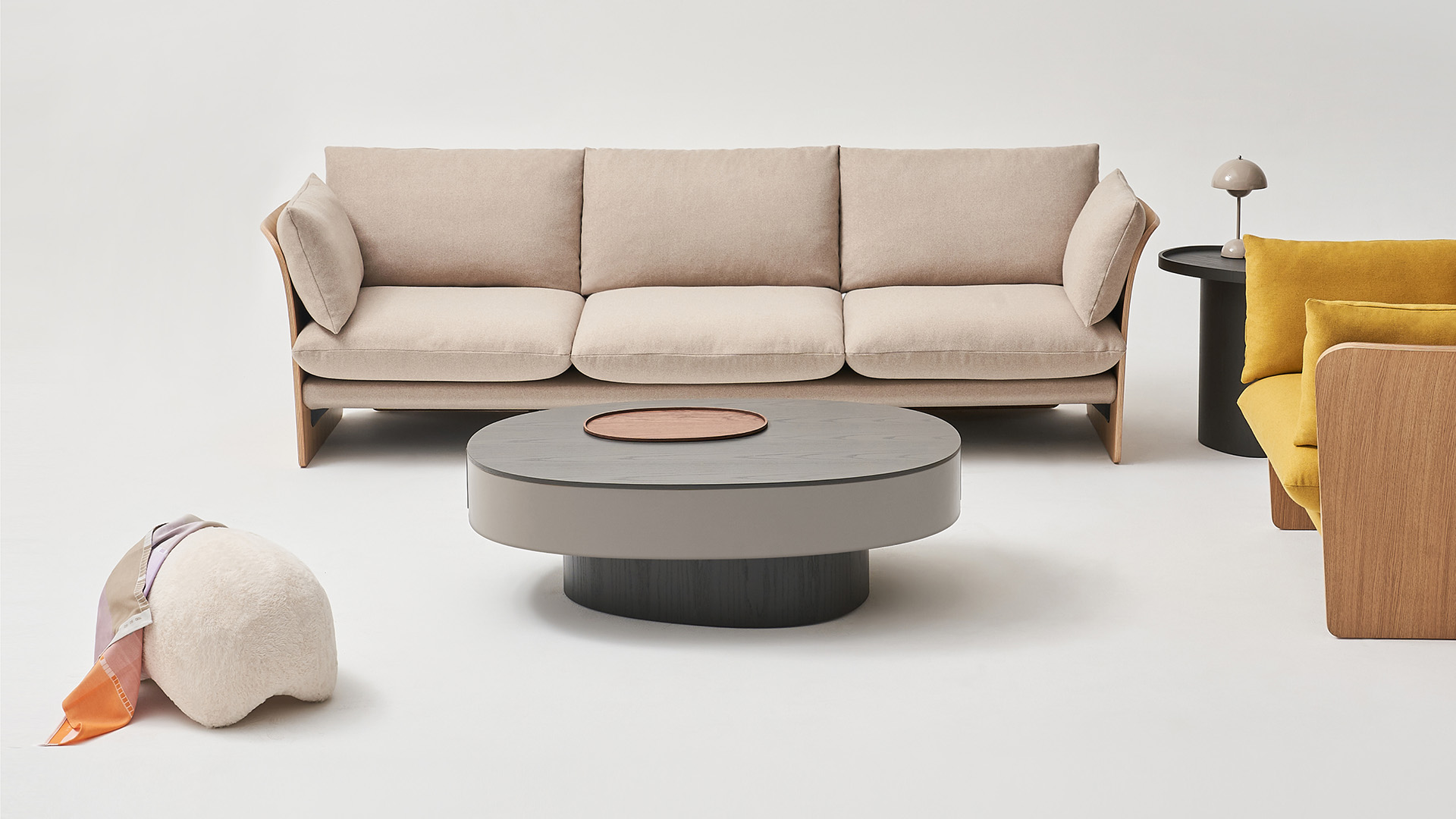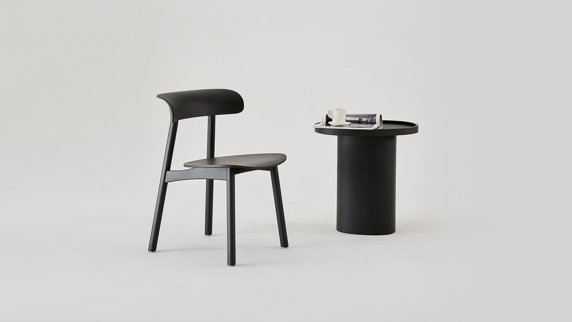 一个由 0 的形态生长而来的咖啡桌系列,桌面与桌腿错开20°,简洁的外形中带有自然的理趣。三种高度和桌面尺寸构成实用的承载--收纳组合,同时为空间注入层次感,亦可作为边桌、床头柜等单独使用。